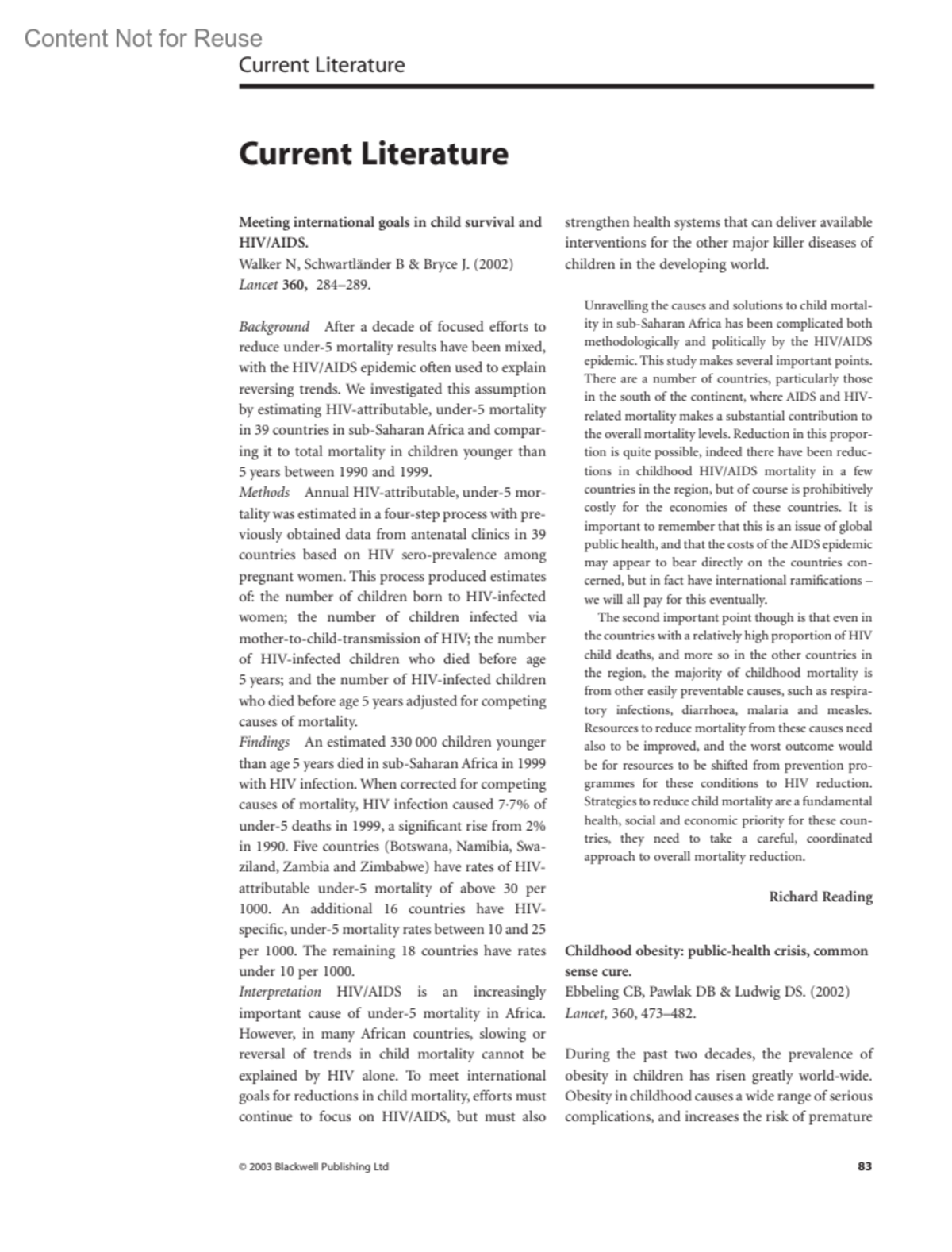 Meeting international goals in child survival and HIV/AIDSReading, RichardChild: Care, Health & Development 29(1):p 83, January 2003.Copyright © 2003 Blackwell Science Ltd.