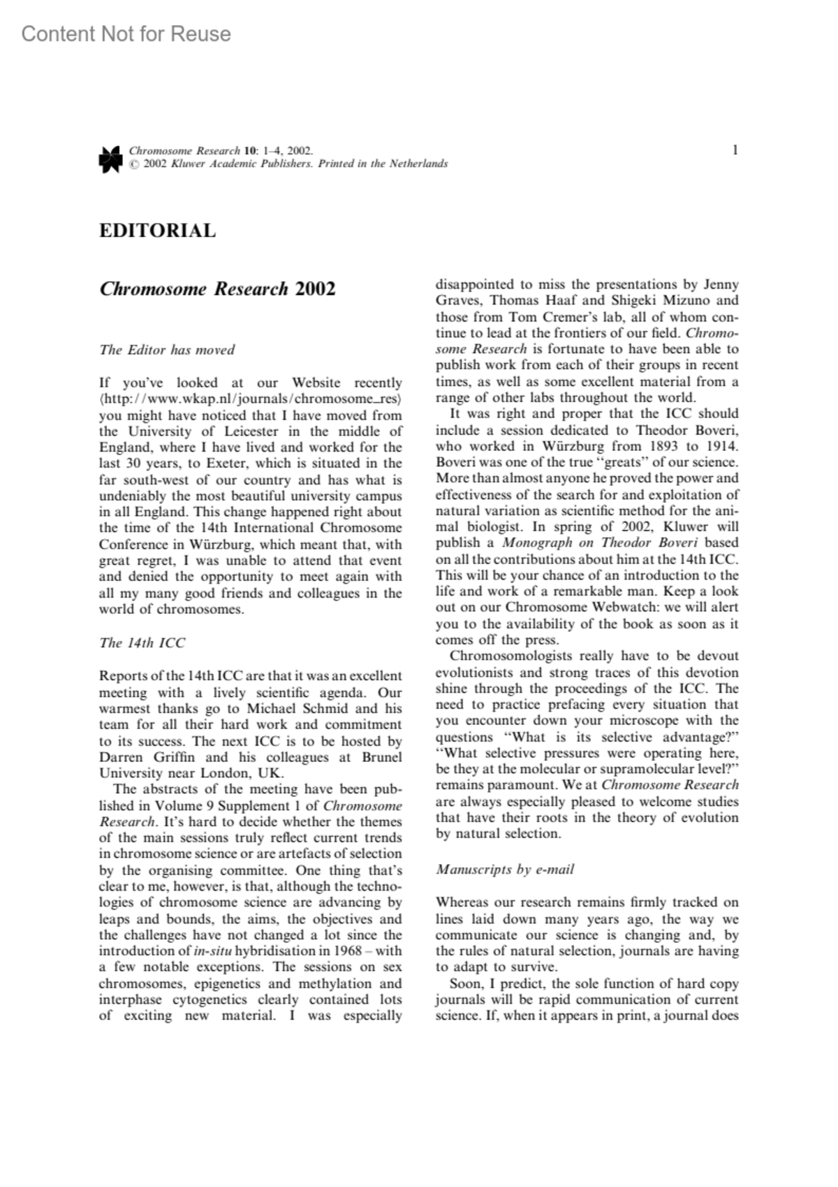 Chromosome Research 2002Macgregor, HerbertChromosome Research 10(1):p 1-4, 2002.Copyright ©2002 Kluwer Academic Publishers