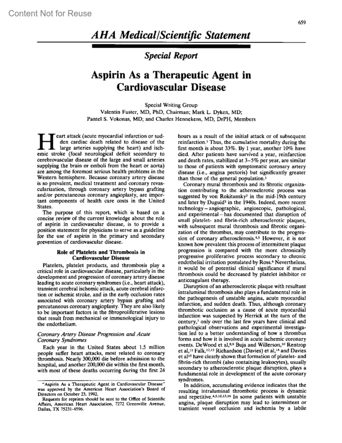 Special Report Aspirin As a Therapeutic Agent in Cardiovascular Disease