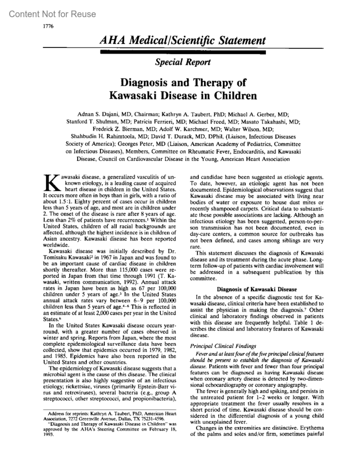 Special Report Diagnosis and Therapy of Kawasaki Disease in Children