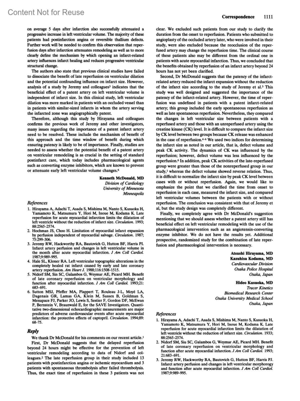 The Patent Infarct-Related Artery After Myocardial InfarctionHirayama, Atsushi MDKodama, Kazuhisa MDKusuoka, Hideo MDAuthor informationCardiovascular Division Osaka Police Hospital Osaka, Japan. (Hirayama) (Kodama)Tracer Kinetics Biomedical Research Center Osaka University Medical School Osaka, Japan (Kusuoka)Circulation 90(2):p 1111-1112, August 1994.Copyright © 1994 American Heart Association, Inc.