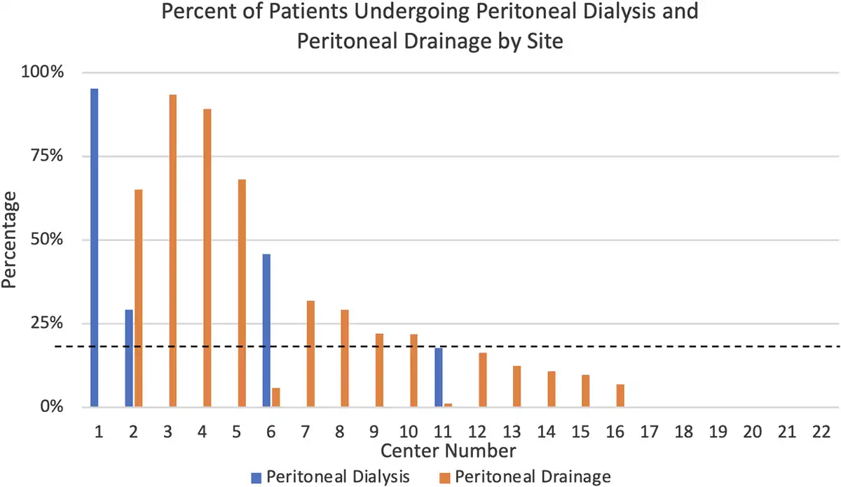Bar chart demonstrating the percent of patients undergoing prophylactic peritoneal dialysis or passive peritoneal drainage by site. Dashed line demonstrates median peritoneal catheter placement across all centers of 18%.