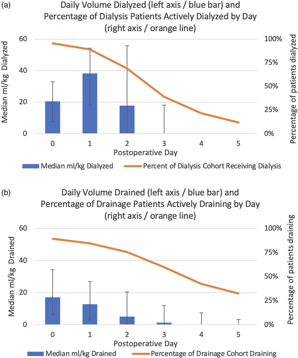 Bar charts demonstrating median [IQR] volume (ml/kg) of fluid removed per day with overlapping line graph showing percentage with active peritoneal dialysis in the Prophylactic Peritoneal Dialysis cohort (A), and percentage undergoing drainage in the Passive Peritoneal Drainage cohort (B). In patients in the Dialysis cohort who also underwent drainage, only net ultrafiltered volume is reported.