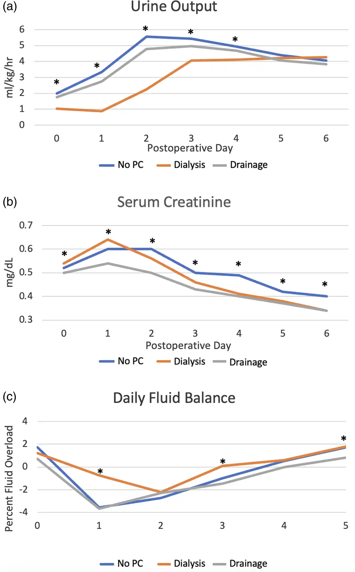Serum creatinine peaked most commonly on post-operative day 1 in all cohorts (53% no peritoneal catheter, 64% dialysis and 55% drainage) and trended down daily thereafter through post-operative day 6. The median serum creatinine is displayed in Fig 3b. Both cohorts with catheters had a statistically significant lower serum creatinine compared to those without catheters on post-operative days 4–6.