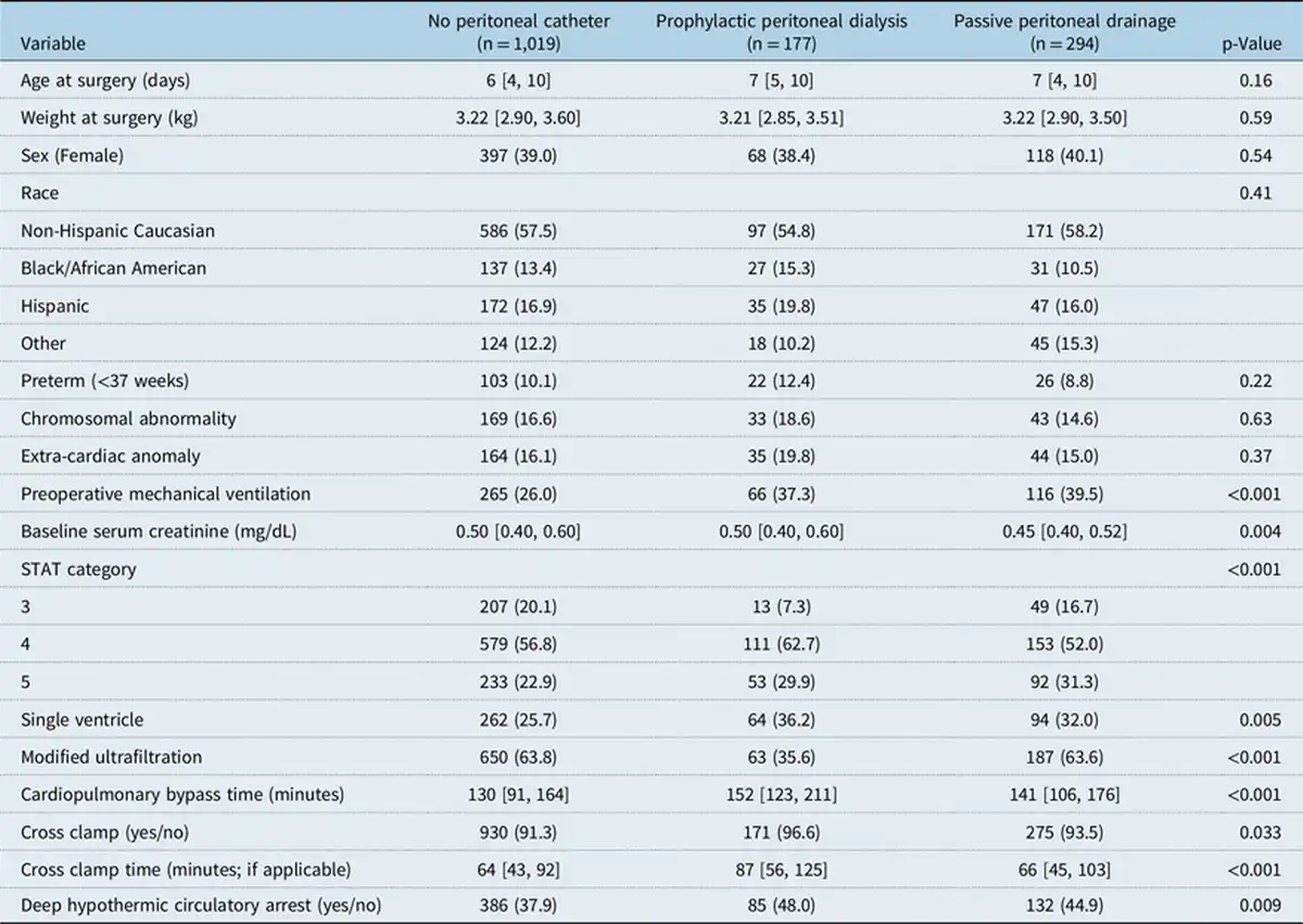Baseline characteristics, demographic, pre-operative, and intraoperative variables were collected. Post-operative variables included detailed data for the first six post-operative days of urine output, fluid balance, creatinine, and dialysis or peritoneal drain use. Adverse events reported to peritoneal catheter4 and potentially related to a peritoneal catheter were collected, including acute kidney injury, necrotising enterocolitis, unplanned gastrointestinal surgery, sternal site infection, and deep surgical site infection. Data were not captured on post-operative placement of a peritoneal catheter for drainage.
