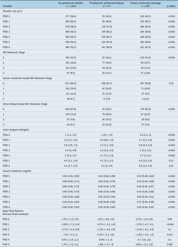 In conclusion, these data show that peritoneal catheter use is frequent, with substantial variability in placement and application among centres. Although short-term oliguria may be seen with prophylactic pancreatic duct, it likely does not reflect true renal injury, which may cast doubt on the use of oliguria in the definition of acute kidney injury in this population. Although we are not able to conclude on clinical benefit of prophylactic peritoneal dialysis or passive peritoneal drainage, our data suggests non-inferiority with respect to acute kidney injury and fluid overload metrics, despite a higher risk cohort. We do not demonstrate an association with reported adverse events. We believe that findings of this study will establish the foundation for future study aimed at understanding the multi-centre association of peritoneal catheter use with clinical outcomes and resource utilisation, which will ultimately determine whether a multi-centre trial is indicated to evaluate for the benefit of peritoneal catheter use in this high-risk population.