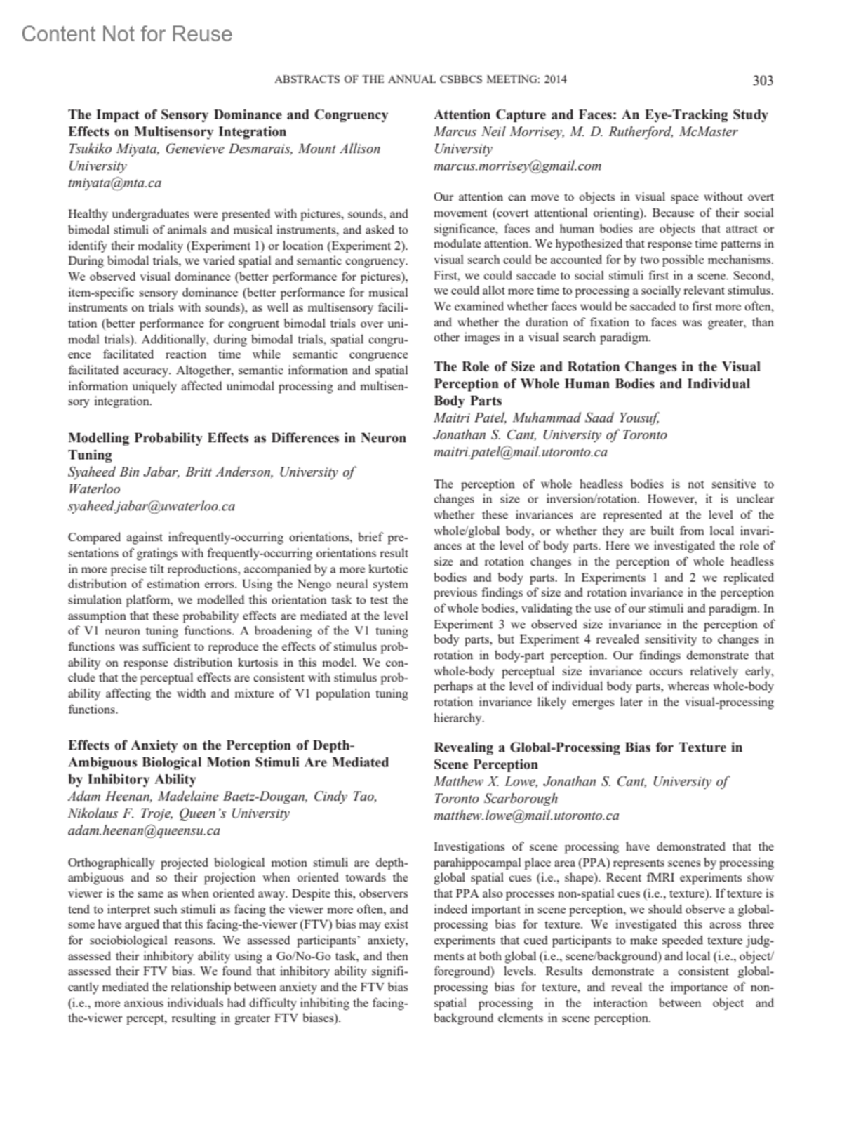 Modelling Probability Effects as Differences in Neuron TuningJabar, Syaheed BinAnderson, BrittAuthor informationUniversity of Waterloo[email protected]Canadian Journal of Experimental Psychology 68(4):p 303, December 2014.Copyright © 2014 by the American Psychological Association