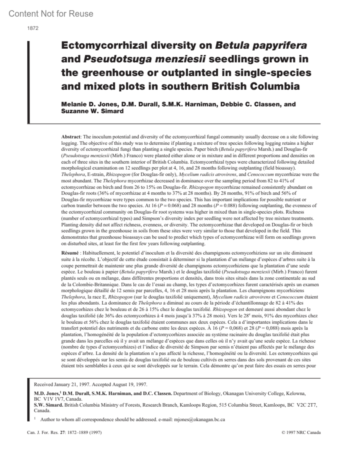 Ectomycorrhizal diversity on Betula papyrifera and Pseudotsuga menziesii seedlings grown in the greenhouse or outplanted in single-species and mixed plots in southern British Columbia