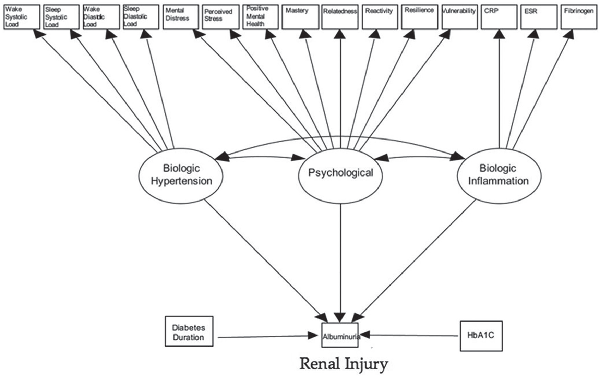 Lavaan 0.5-18 (LAtend VAriable ANalysis; Rosseel, 2012) was then used to fit the SEM to the study participants using diagonally weighted least squares, to accommodate 15 continuous indicators and the primary outcome, albuminuria. With item factor analysis, a continuous underlying variable was assumed to be related to albuminuria and its threshold estimated as part of the model fit. Three latent factors were included: hypertension (4 indicators = wake systolic and diastolic blood pressure loads and sleep systolic and diastolic blood pressure loads), inflammation (3 indicators = CRP, ESR, fibrinogen), and psychological wellness (indicators = distress [K6 score], perceived stress [PSS-14 score], positive mental health [MHC score], and resiliency measures: mastery, relatedness, reactivity, resourcefulness, and vulnerability). All latent factors were assumed to covary and each was independently allowed to causally influence albuminuria status. HbA1c and diabetes duration were treated as independent covariates with causal paths leading directly to the outcome. Model fit was assessed by chi-square, RMSEA, and comparative fit indices (Tucker–Lewis index [TLI]). Scale was imposed on the latent factors using the standardization method (mean = 0, SD = 1; all loadings freely estimated), and conditional local independence was assumed for all manifest variables. Missing data were imputed using multiple chained equations with 20 complete datasets. To facilitate comparison and interpretation, all parameter estimates are based on standardized variables and interpretable as correlations. The a priori theoretical model was developed by the iCARE investigators based on exploratory factor analysis, review of the literature, and input from our patient advisory group with post hoc assessment of the assumed structural form based on residual correlations and modification indices.
