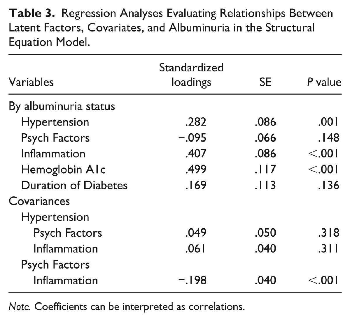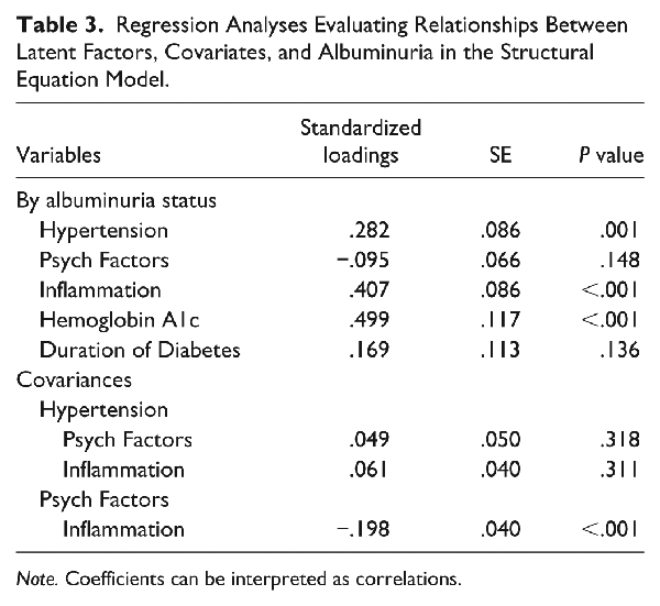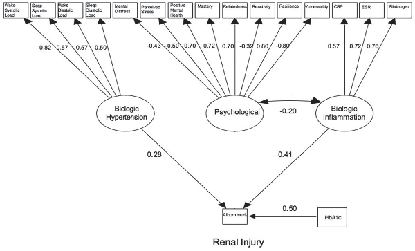 Table 3 describes results from the regression analyses of the association between latent factors, covariates, and albuminuria status. Significant associations were seen with coefficients for hypertension (β = 0.28; P = .001), inflammation (β = 0.41; P < .001), and HbA1c (β = 0.50; P < .001) in the structural model for albuminuria. Psychological factors were not directly associated with albuminuria; however, there was a significant association between the psychological latent factor and inflammation (β = −0.20; P < .001). This model explained 44.0% of the variance in the albuminuria status.