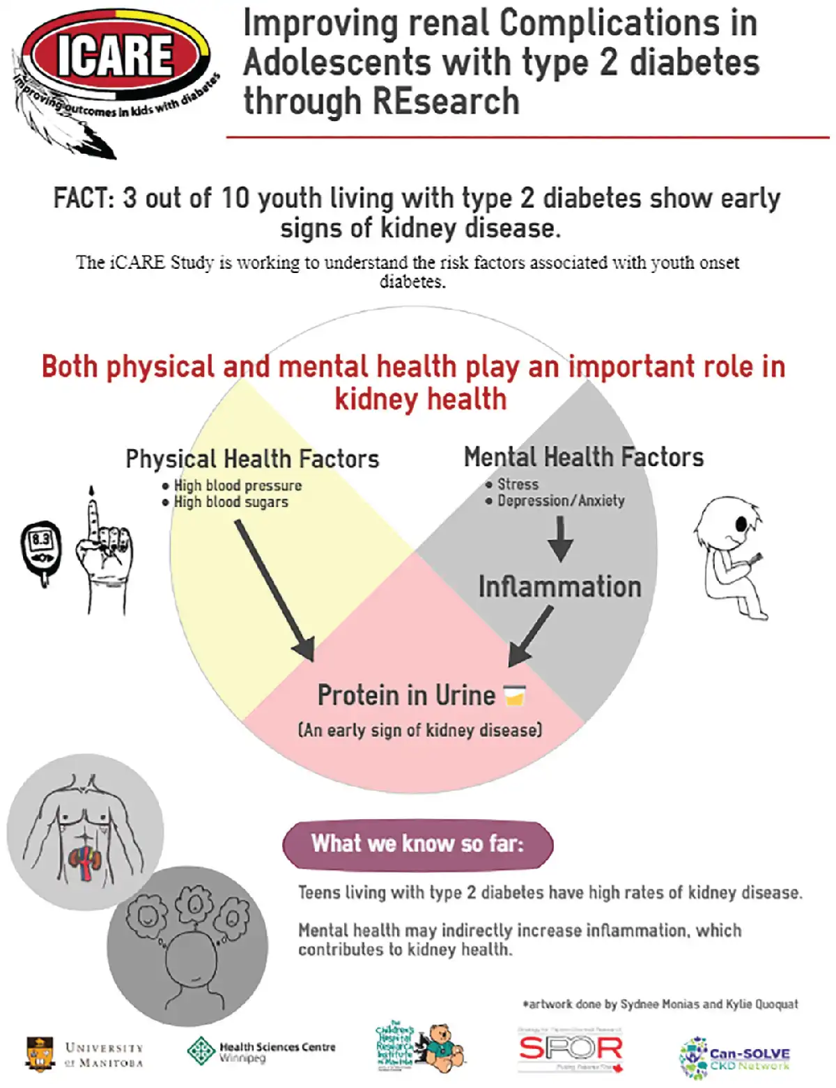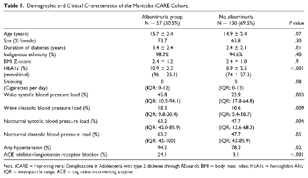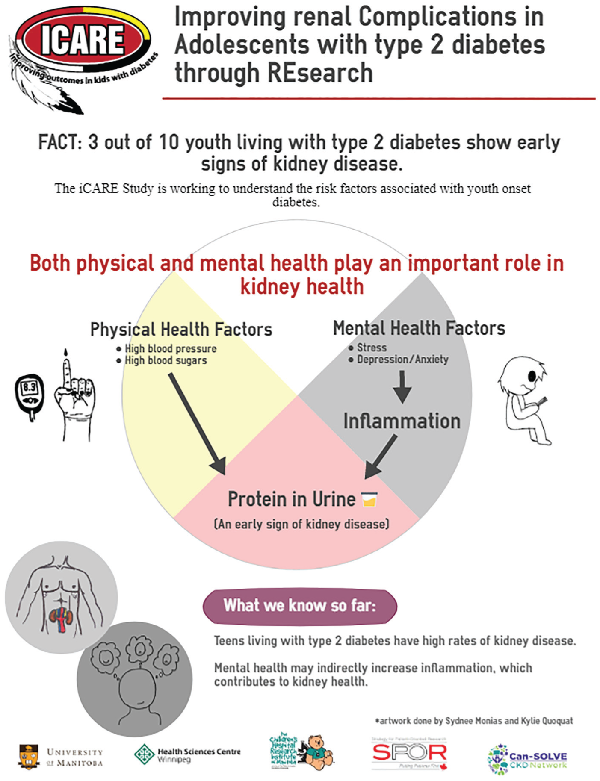 The iCARE study rationale, design, and methods have previously been reported. In brief, iCARE is a prospective cohort study designed to discover novel risk factors and therapeutic targets for the prevention and treatment of albuminuria and progression of CKD in youth with type 2 diabetes. The study began as a single-center study in Winnipeg, Manitoba, and has now been funded to expand to a multicenter study to test a holistic bio-psycho-social (BPS) model of renal health trajectories in youth with type 2 diabetes of broader ethnic diversity with a planned sample size of 400 youth. This initial cohort was predominantly Indigenous and recruited from Manitoba and Northwestern Ontario. The study protocol was approved by the biomedical research board at the University of Manitoba, in accordance with the Declaration of Helsinki. All patients or their guardians (if less than 18 years of age) provided informed consent and youth less than 18 years provided assent. In addition, our study is guided by a patient and parent advisory group and an advisory board with representation from community and government-based organizations (First Nations Health and Social Secretariat of Manitoba, the regional CIHR-funded Partners for Engagement and Knowledge Exchange, and primary care and community-based care representatives).