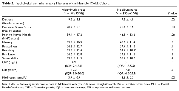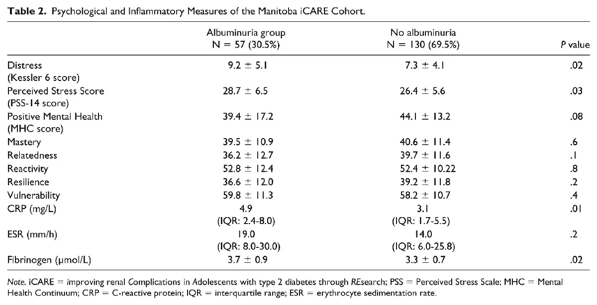 There is an increasing awareness of the potential interactions between mental and physical health among adolescents. In the context of a chronic disease such as type 2 diabetes, psychological factors can impact quality of life and play an important role in self-management and the adoption of healthy lifestyle behaviors., Quality of life is lower and rates of depression are higher among youth with type 2 diabetes, relative to peers with type 1 diabetes. Indigenous youth are even more susceptible to poor mental health in part due to the combined social factors that Indigenous youth face (poverty, and racism) and the ongoing effects of multigenerational trauma. This is the first study in Indigenous youth with type 2 diabetes to determine whether various aspects of mental health are associated with albuminuria. Although the SEM did not reveal a direct association between the cluster of mental health variables and albuminuria, the mental health latent factor was associated with elevated inflammatory biomarkers, which were themselves associated with albuminuria. Negative mental health factors can manifest in elevated stress, which activates the hypothalamic-pituitary axis and the production of cortisol. This is a maladaptive process and can lead to systemic inflammation. Many recent studies have identified important associations between higher levels of inflammatory cytokines and diabetes complications, and there is also evidence that many anti-diabetic treatments have anti-inflammatory properties that are independent of their hypoglycemic effects. Evidence is starting to emerge in adult populations that integrative care models which address biomedical, psychological, and social diabetes care lead to both improved mental health and physical health. At this point, the impact of this type of treatment on systemic inflammation is unknown but does warrant future study. Our study does support the importance of screening for and managing poor mental health in the clinical management of Indigenous youth with type 2 diabetes.