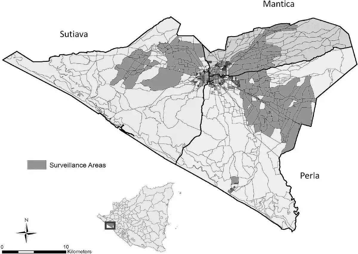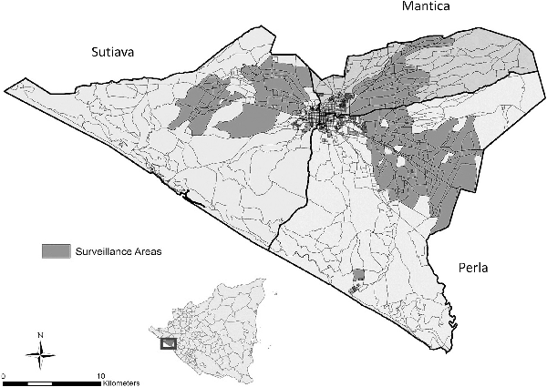 León municipality in Nicaragua and map of the León health and demographic surveillance system clusters. The small map in the bottom left corner of the figure shows the location of León municipality within the country of Nicaragua. The municipality of León has an area of 820 km2, making it the second largest city in Nicaragua []. The dark grey and black areas in the larger map represent the clusters that form the León Health and Demographic Surveillance System. Cluster sampling was conducted in each territory of the municipality of León: Perla, Sutiava, and Mantica. All three territories include both rural and urban areas.