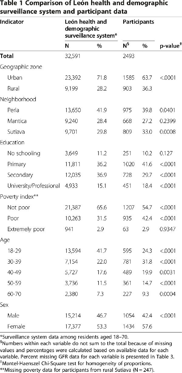 Of the 3000 individuals initially selected to participate in this study, 2493 completed questionnaires, with 91% (n = 2275) also providing blood samples for analysis of serum creatinine. Seven percent of those approached were not available for interview, the majority of whom had migrated, and less than 10% refused. A number of participant demographic characteristics were different compared to those of the surveillance system (Table 1), which is why overall and sex-specific prevalence estimates were standardized to population-representative surveillance and census population data (see Table 2).