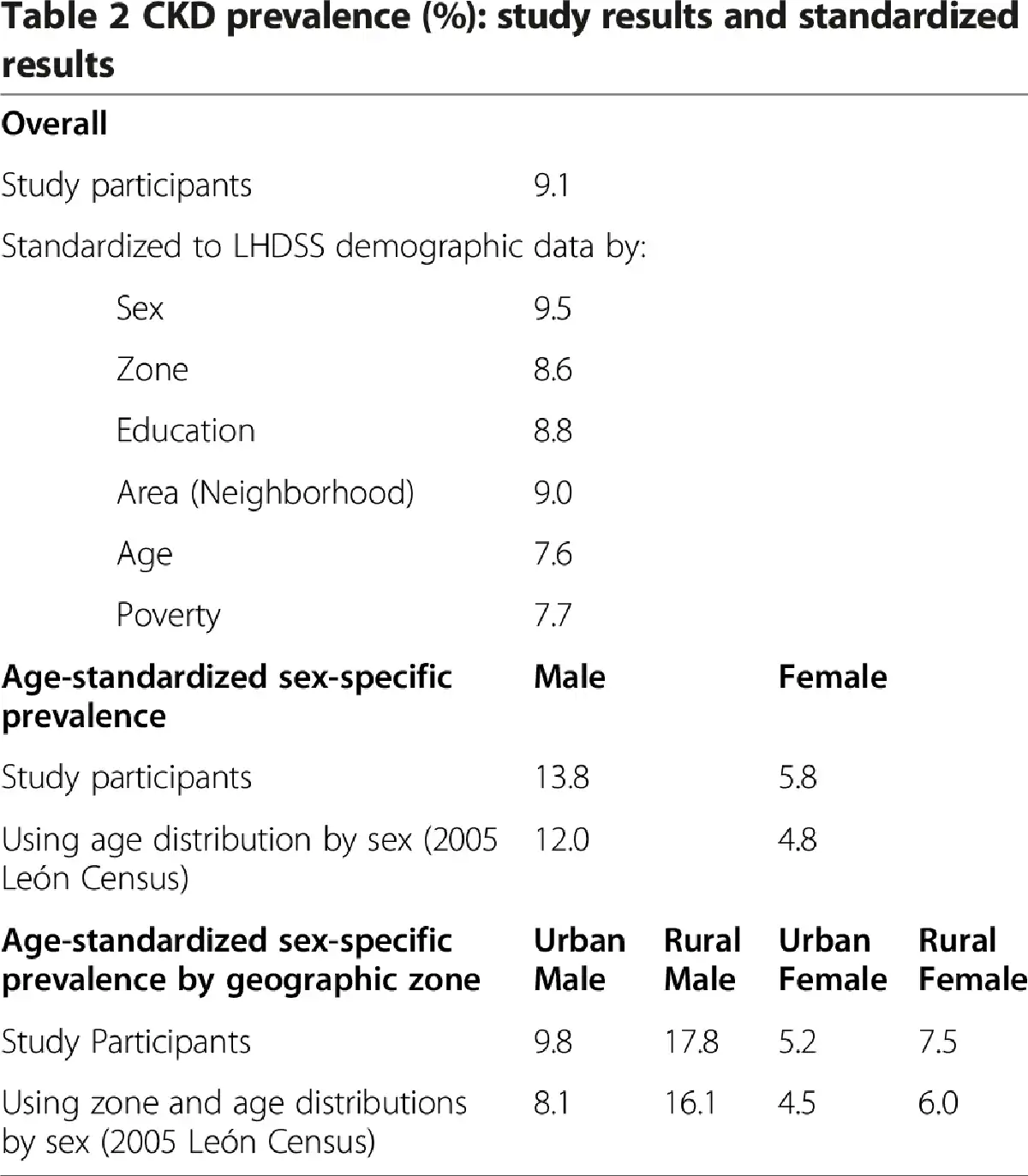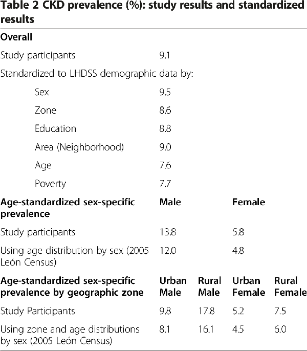 CKD Prevalence estimates were directly standardized to the LHDSS population by age, sex, education, poverty, neighborhood, and geographic zone. Age-standardized prevalence proportions were calculated using 2005 León Census [] as the reference population.