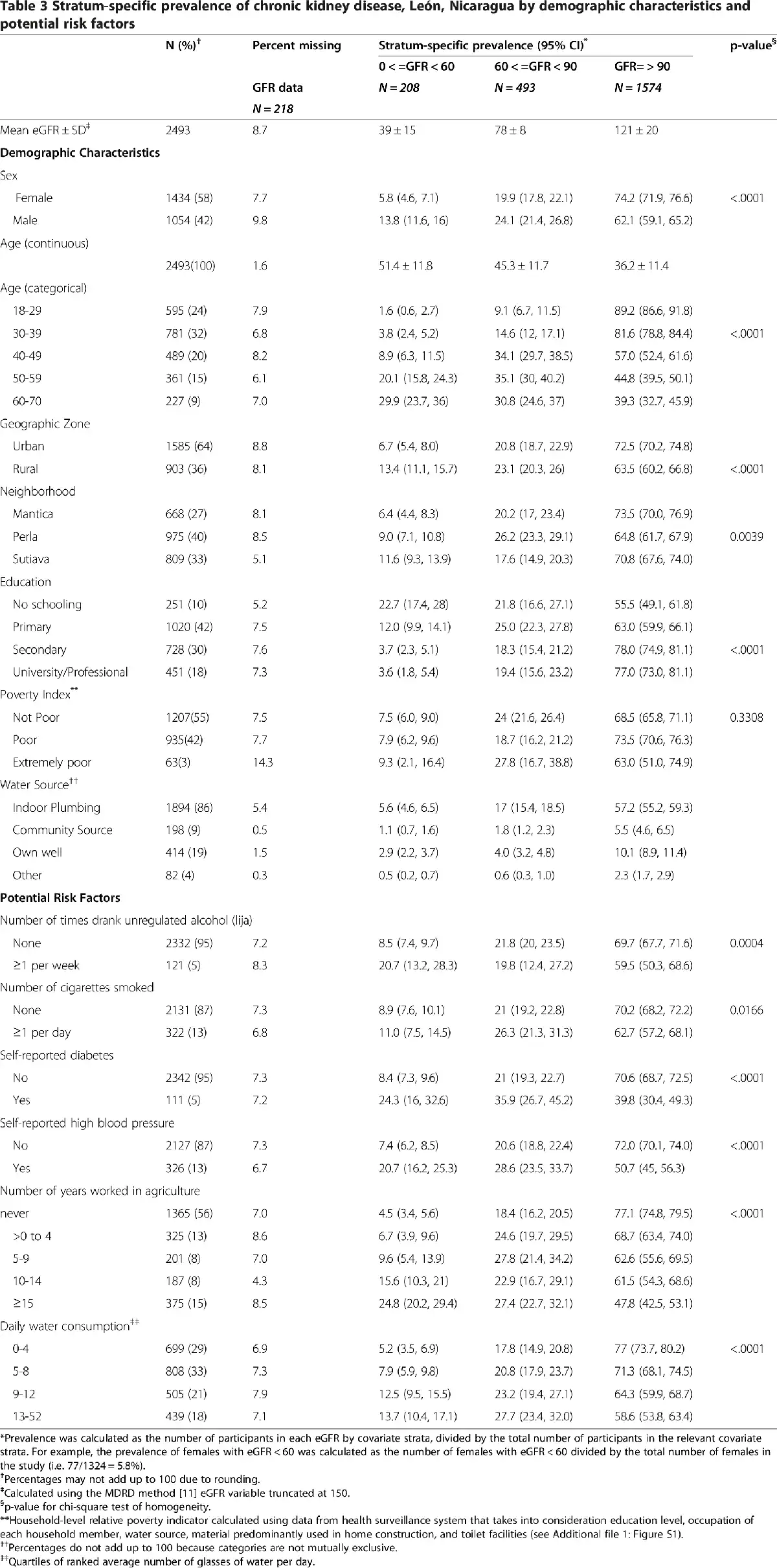 Prevalence of CKD among men was more than double the prevalence among women (13.8% vs. 5.8%: Table 3). Prevalence of CKD was significantly greater among participants in older age groups (20.1% for those aged 50–59 and 29.9% for those aged 60–70). Mean age was highest for those with eGFR < 60 (51 yrs ± 12) compared to those with 60 ≤ eGFR < 90 (45 yrs ± 12) and those with an eGFR ≥ 90 (36 yrs ±11). Rural areas had higher prevalence (13.4%) than urban areas (6.7%), with the highest prevalence observed in Sutiava (11.6%), and no difference was seen across three levels of household poverty.