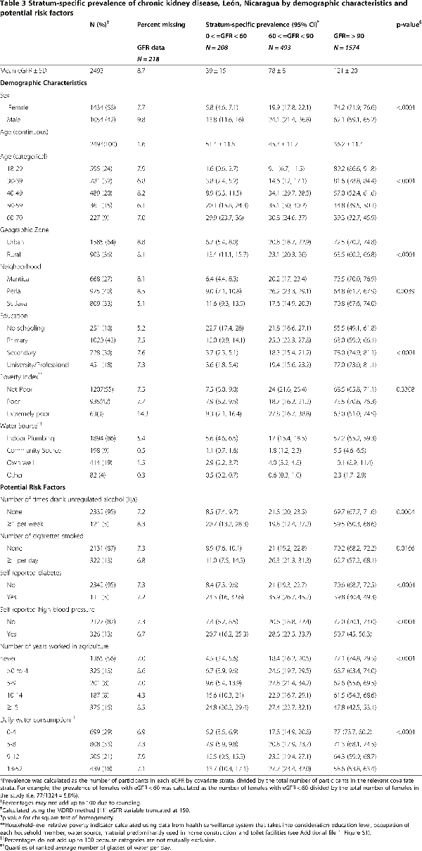 The results of this study, conducted among a large population-based sample of residents of the Pacific Coastal municipality of León, Nicaragua, confirm prior findings of high prevalence of CKD in this region and point to the likely contribution of non-traditional risk factors to this burgeoning regional CKD epidemic. Elevated prevalence appears to be concentrated in rural zones and among agricultural workers.