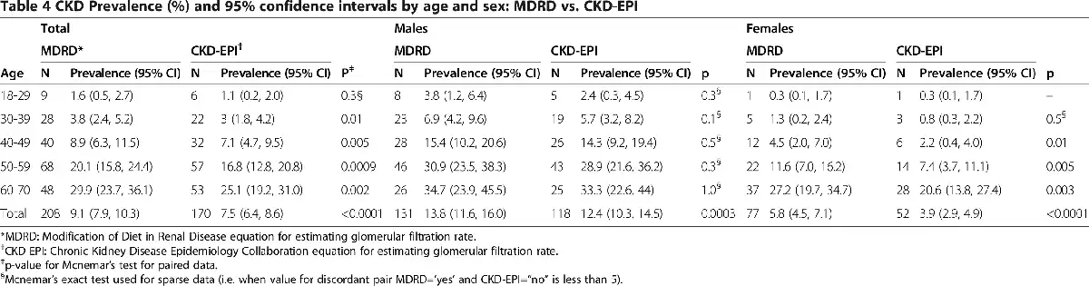 The MDRD study equation is reasonably accurate at eGFRs of less than 60 mL/min per 1.73 m2; however, its major limitations are imprecision and systematic underestimation of measured GFR at higher values, leading to overestimation of CKD prevalence. The CKD-EPI equation has less bias at high eGFRs and is more accurate for predicting adverse outcomes than is the MDRD equation []. To assess the extent of bias in CKD prevalence estimates, we calculated prevalence of eGFR < 60 overall, by sex, by age category, and by age and sex category using the CKD-EPI equation. For prevalence proportions <1%, the Wilson score interval was used to calculate 95% confidence intervals []; otherwise the standard Wald method was used. McNemar's tests for difference in proportions within subjects were performed to assess homogeneity of the CKD definition using the CKD-EPI and MDRD equations. Because CKD-EPI estimates are always lower than MDRD estimates, we used a one-sided p-value (α = 0.1). Using a Bonferroni correction for multiple comparisons, our critical value for significance was 0.1/18 = .0056.