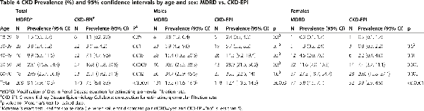 Prevalence of CKD in León was attenuated in all strata when GFR was estimated using the CKD-EPI equation instead of the MDRD equation (Table 4). Prevalence estimates using the CKD-EPI equation were significantly lower for the overall study population and within all but the youngest two age groups. Among females, CKD-EPI estimates were significantly lower overall and in the two oldest age categories. For males, only the total prevalence estimate was significantly lower using CKD-EPI. Prevalence of CKD was higher among males for all age groups, regardless of equation used.
