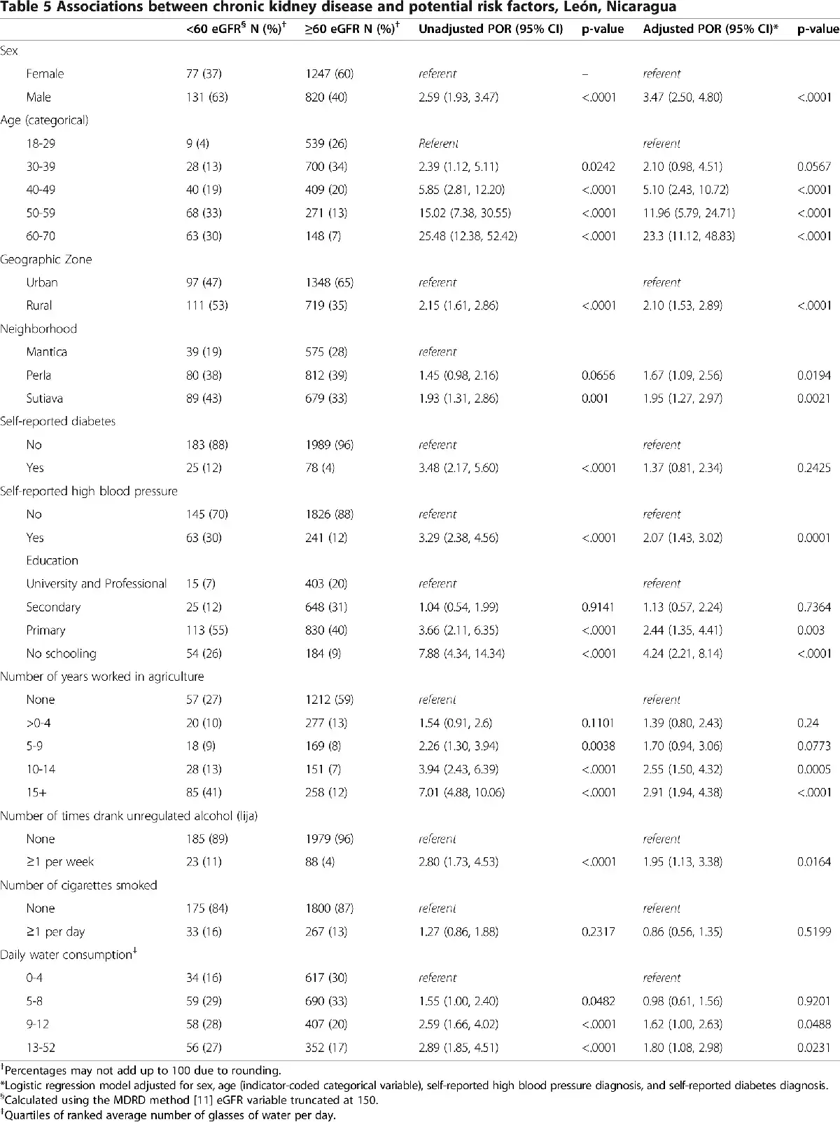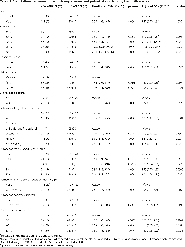We also found a lack of education to be highly associated with CKD. No other studies in this region have found a distinct association between education level and CKD. In a country with such little wealth, education may be a better indicator of socioeconomic status than household poverty level. However, missing poverty data from the poorest neighborhood, Sutiava, may have biased estimates towards no association between poverty and CKD. Additionally, odds of CKD was elevated in Perla and Sutiava compared to Mantica, though the reason for this is unknown. Future studies should evaluate environmental and structural factors that may be different by neighborhood, such as water contamination and distance to a local clinic.