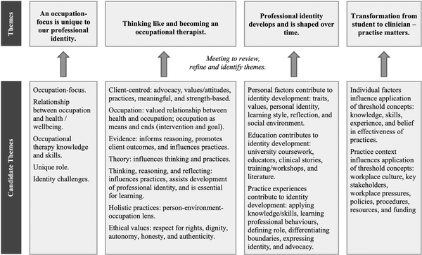Four major themes were developed: Themes 1 and 2 relate to professional identity: (a) an occupation-focus is unique to our professional identity, and (b) professional identity develops and is shaped over time. Themes 3 and 4 explored the link between professional identity and threshold concepts: (c) thinking like and becoming an occupational therapist, and (d) transformation from student to clinician—practice matters.