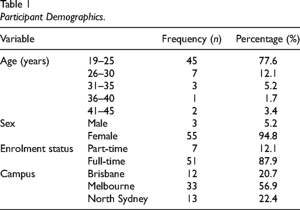 Of the 230 students eligible and invited to participate in the survey, 84 participants responded but 26 were excluded as only demographic data were provided resulting in 58 participants (response rate of 25%). Demographic data are presented in Table 1.