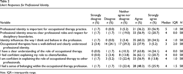 Professional identity refers to an individual's sense of self, informed by the values, attitudes, skills, and knowledge shared with others in their professional group (; ). Identity development occurs over time and is influenced by practice education, role-modeling, professional socialization, academic learning, and assessment activities (; ; ; ; ; ; ). Professional identity is significant, as it influences members’ thinking and behaviors and allows individuals to elucidate meaning and social contribution () and assert professional status (; ; ). Professional identity contributes to a sense of worth, self-efficacy, self-esteem, and pride (), and safeguards against work-related stress and burnout (). Occupational therapists report challenges in articulating identity (; ; ; ) so it is important to understand undergraduate students’ professional identity development, and whether students can articulate their identity.