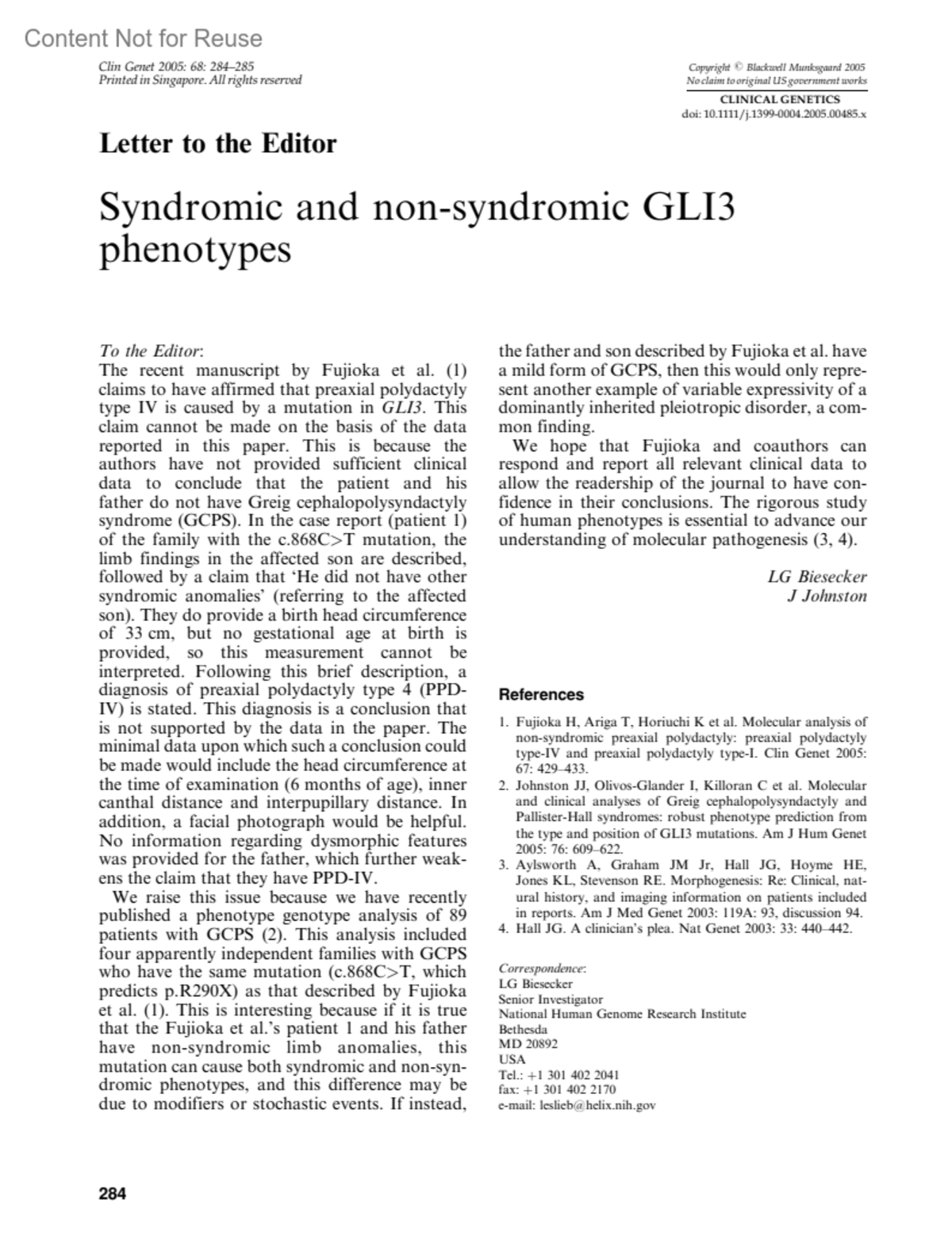 Syndromic and non-syndromic GLI3 phenotypesFujioka, HAriga, TAuthor informationCorrespondece: Hirotaka Fujioka, Plastic Surgery, Bibai Roisai Hospital, 3-1 E4 S1, Bibai, Hokkaido, Japan. Tel.: +81 126 63 2151; fax: +81 126 66 2133; e-mail: [email protected]Clinical Genetics 68(3):p 285, September 2005.Copyright © 2005 Blackwell Publishing Ltd.