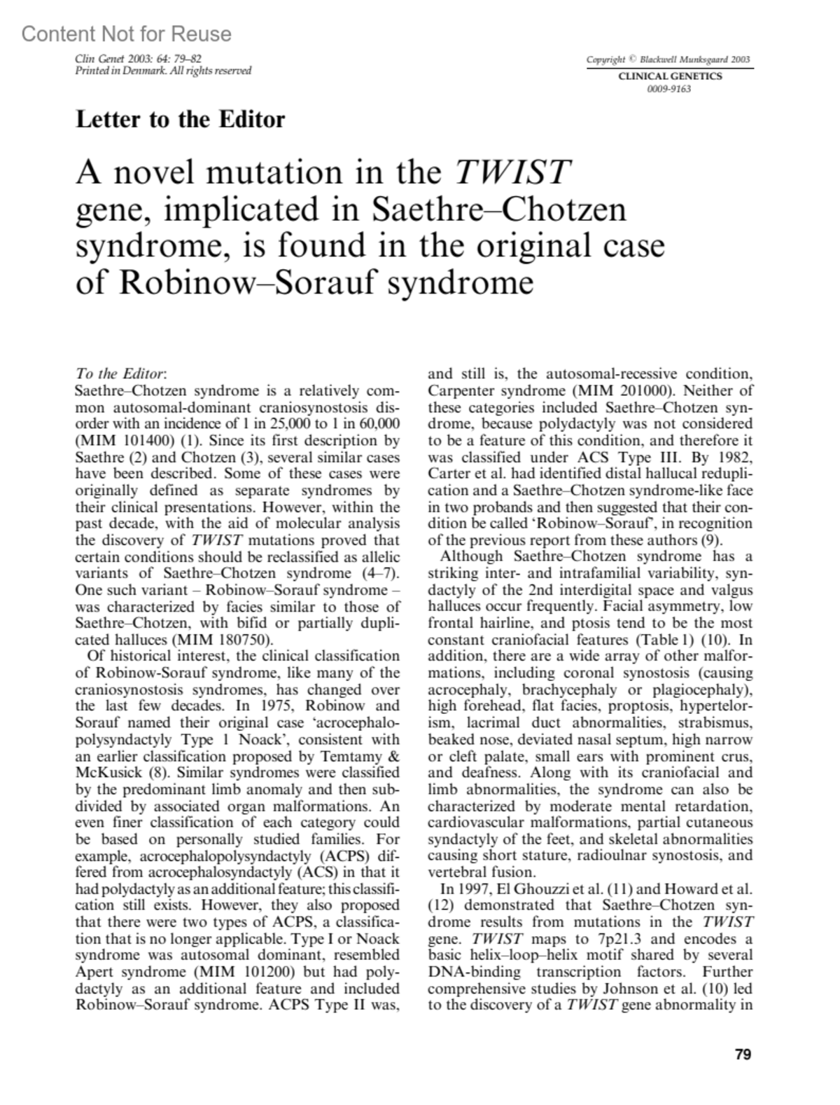 A novel mutation in the TWIST gene, implicated in Saethre–Chotzen syndrome, is found in the original case of Robinow–Sorauf syndrome