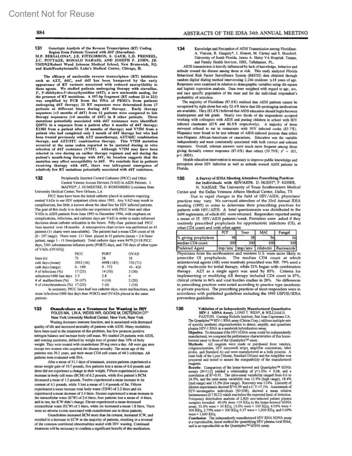 A Survey of IDSA Meeting Attendees Prescribing Practices for Individuals with HIV/AIDS.135SKIEST, D.KEISER, P.NASSAR, N.Author informationThe University of Texas Southwestern Medical Center and the Dallas Veterans Affairs Medical Center, Dallas, TXClinical Infectious Diseases 23(4):p 884, October 1996.Copyright © Copyright Oxford University Press 1996.