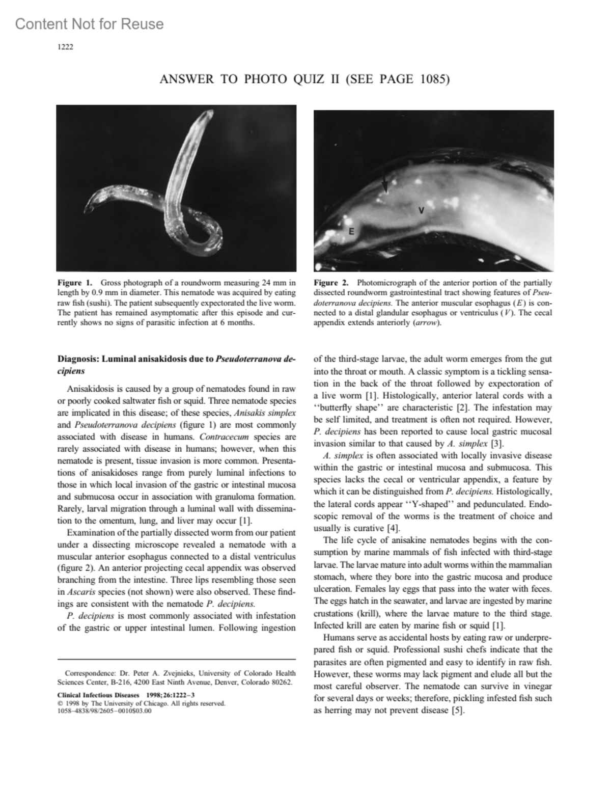 ANSWER TO PHOTO QUIZ II (SEE PAGE 1085)Zvejnieks, Peter A.Lichtenstein, Kenneth A.Koneman, Elmer W.Author informationUniversity of Colorado Health Sciences Center; the Columbia Rose Medical Center; and the Denver Veterans Affairs Medical Center, Denver, ColoradoCorrespondence: Dr. Peter A. Zvejnieks, University of Colorado Health Sciences Center, B-216, 4200 East Ninth Avenue, Denver, Colorado 80262.Clinical Infectious Diseases 26(5):p 1222-1223, May 1998. | DOI: 10.1086/520293Copyright © Copyright Oxford University Press 1998.