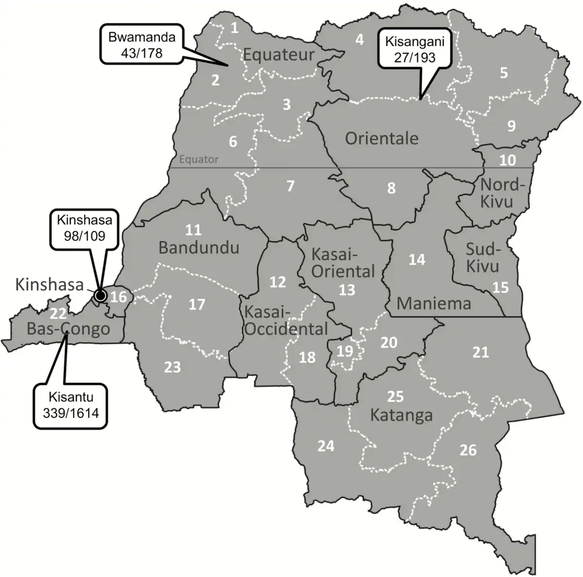 In 2015, the 11 DRC provinces were split into the actual 26 provinces; for convenience of data display and comparison with previous publications, the former provinces were still used as the reference.