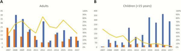 Over-time evolution of the frequency of Salmonella Typhi compared to non-Typhi Salmonella for adults (A) and children aged <15 years (B). The absolute numbers of Salmonella Typhi and non-Typhi Salmonella are shown by the blue and orange bars, respectively, and can be read on the left y-axis (note that the y-axis has a different scale for adults vs children). The yellow line represents the percentage of Salmonella Typhi vs all Salmonella isolates (Typhi and non-Typhi combined), reflected on the right y-axis.