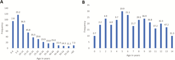 Distribution of Salmonella Typhi bloodstream infection episodes per age category (A) and per year of age for children (B), in absolute numbers (bars) and as a percentage of the total number of pathogens from patients with the same age (shown at top of bars). Data were generated for a total of 519 of 531 episodes for which data on age were recorded.