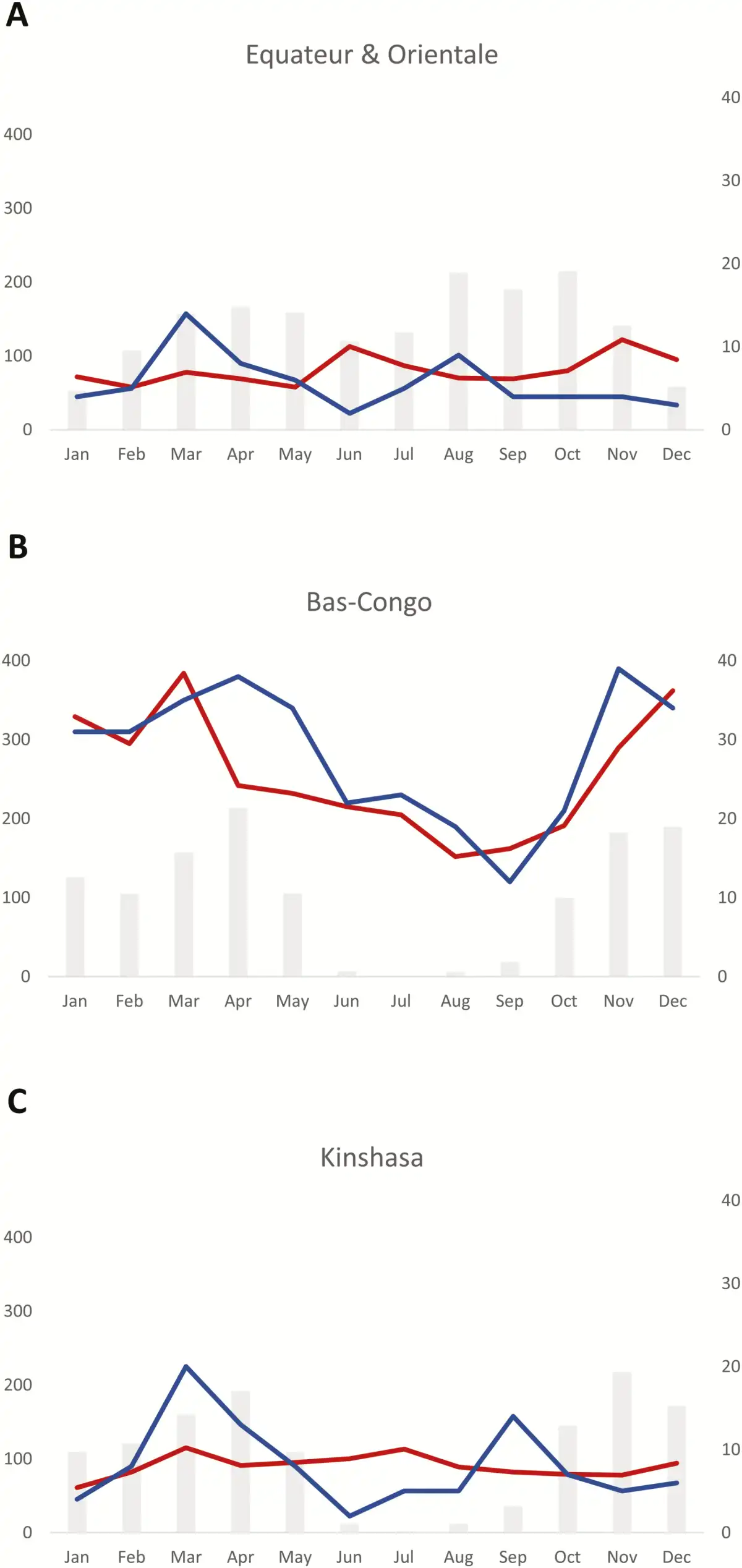 Relation between rainfall and frequency of Salmonella Typhi bloodstream infection in a rural area north (Orientale and Equateur, A) and south (Bas-Congo, B) of the equator, and an urban area (Kinshasa, C). The average rainfall for the 10-year surveillance period is displayed as gray bars and expressed in millimeters per month (left y-axis), the average numbers of Salmonella Typhi isolates (blue line), and bloodstream infection episodes caused by all pathogens (red line) per month, corresponding to the right y-axis.
