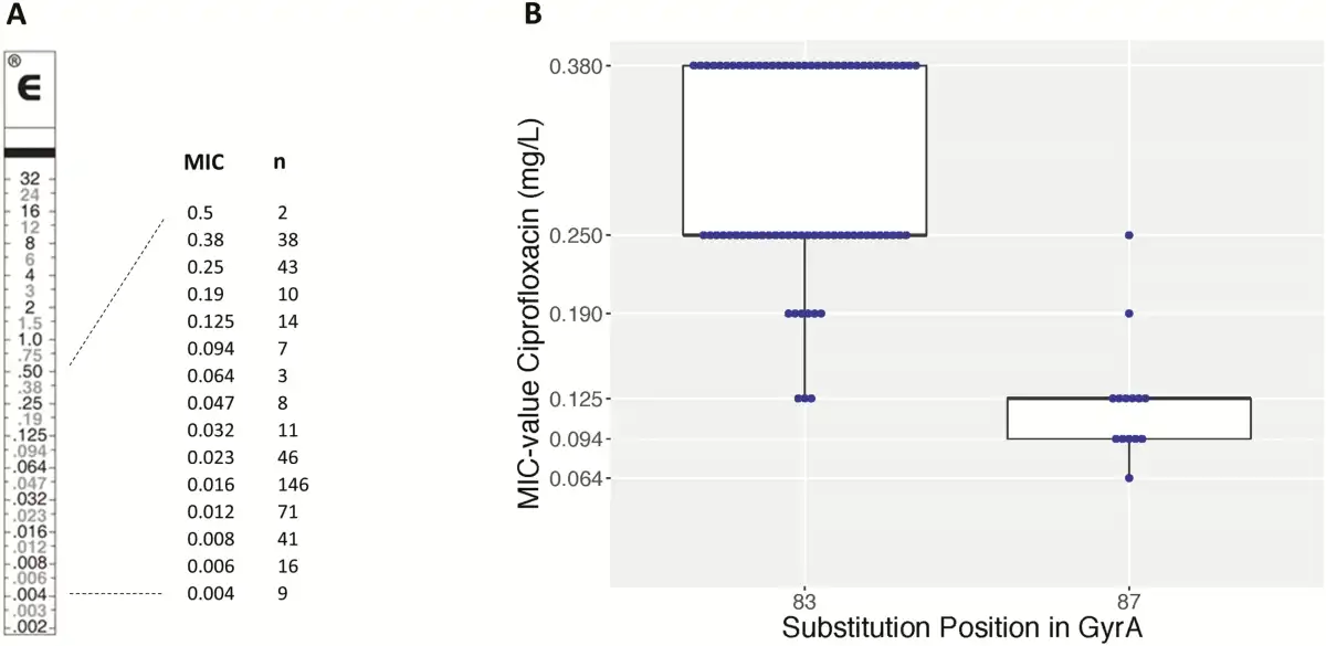 A, Minimum inhibitory concentration (MIC) values of ciprofloxacin for 465 isolates of Salmonella Typhi with decreased ciprofloxacin susceptibility, along an E-test macromethod strip. B, Box plot with ciprofloxacin MIC values for S83F and D87G amino acid substitutions in gyrA. Abbreviation: MIC, minimum inhibitory concentration.
