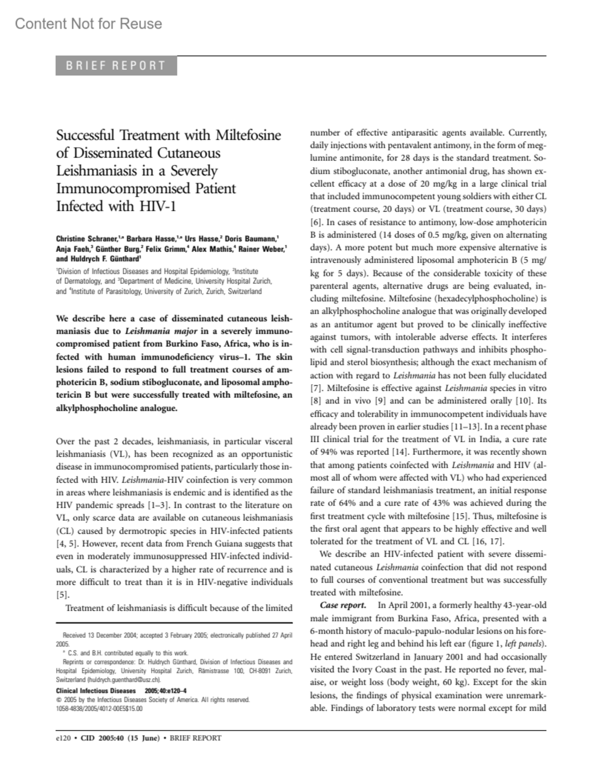 Successful Treatment with Miltefosine of Disseminated Cutaneous Leishmaniasis in a Severely Immunocompromised Patient Infected with HIV-1