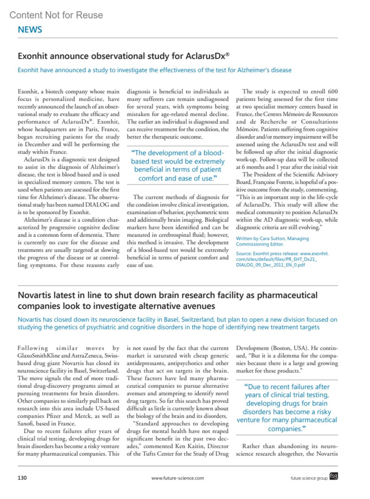 Novartis latest in line to shut down brain research facility as pharmaceutical companies look to investigate alternative avenuesClinical Investigation 2(2):p 130-131, February 2012.Copyright © 2012 Future Science Ltd.