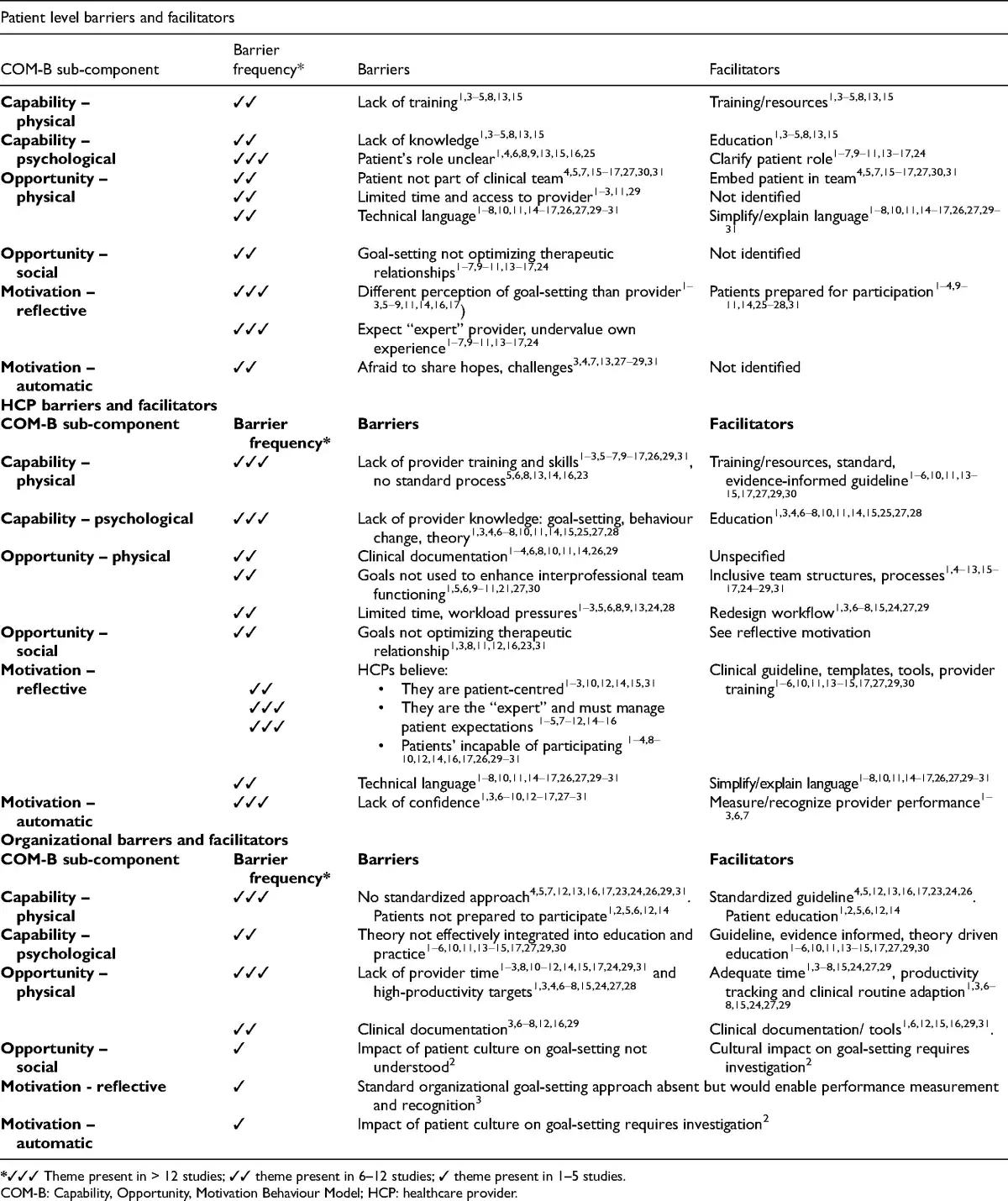 Most authors identified the lack of a standardized goal-setting approach, which includes tools,,,,,,, policies and integration of theory to support practice change, and goal-setting skill development for providers and preparation for patients.,,–,–,–,