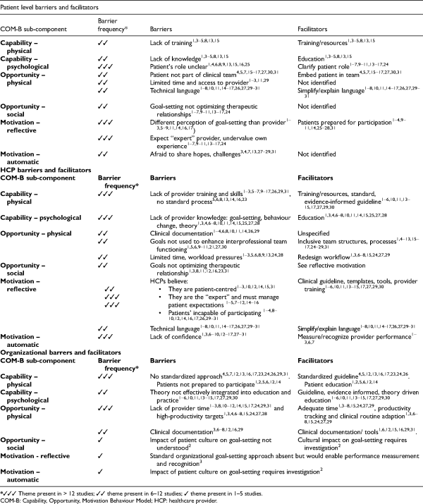 Providers” attitudes and beliefs about patient-centred goal-setting were the most frequently identified barrier. Providers believe they are already providing patient-centred goal-setting.–,,,,, Many assume it is their role to be the expert and patients want them to be directive.–,–,– Providers feel patients are incapable of participating in goal-setting because of a lack of knowledge about their condition, goal-setting and rehabilitation processes.–,–,,,,,,–
