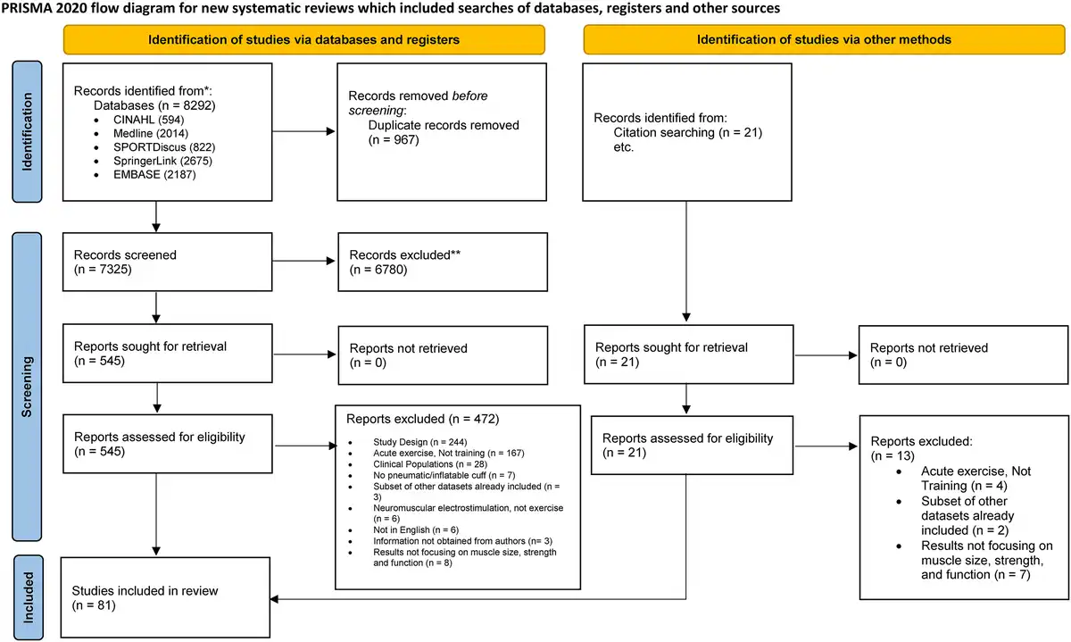A total of 8292 articles were retrieved from database searches as follows: Medline (2014), SPORTDiscus (822), CINAHL (594), Embase (2187) and SpringerLink (2675). An additional 21 studies that fulfilled the inclusion criteria were identified from the reference lists of prior reviews related to the topic of blood flow restriction exercise. The studies were approved for inclusion among the original search results.