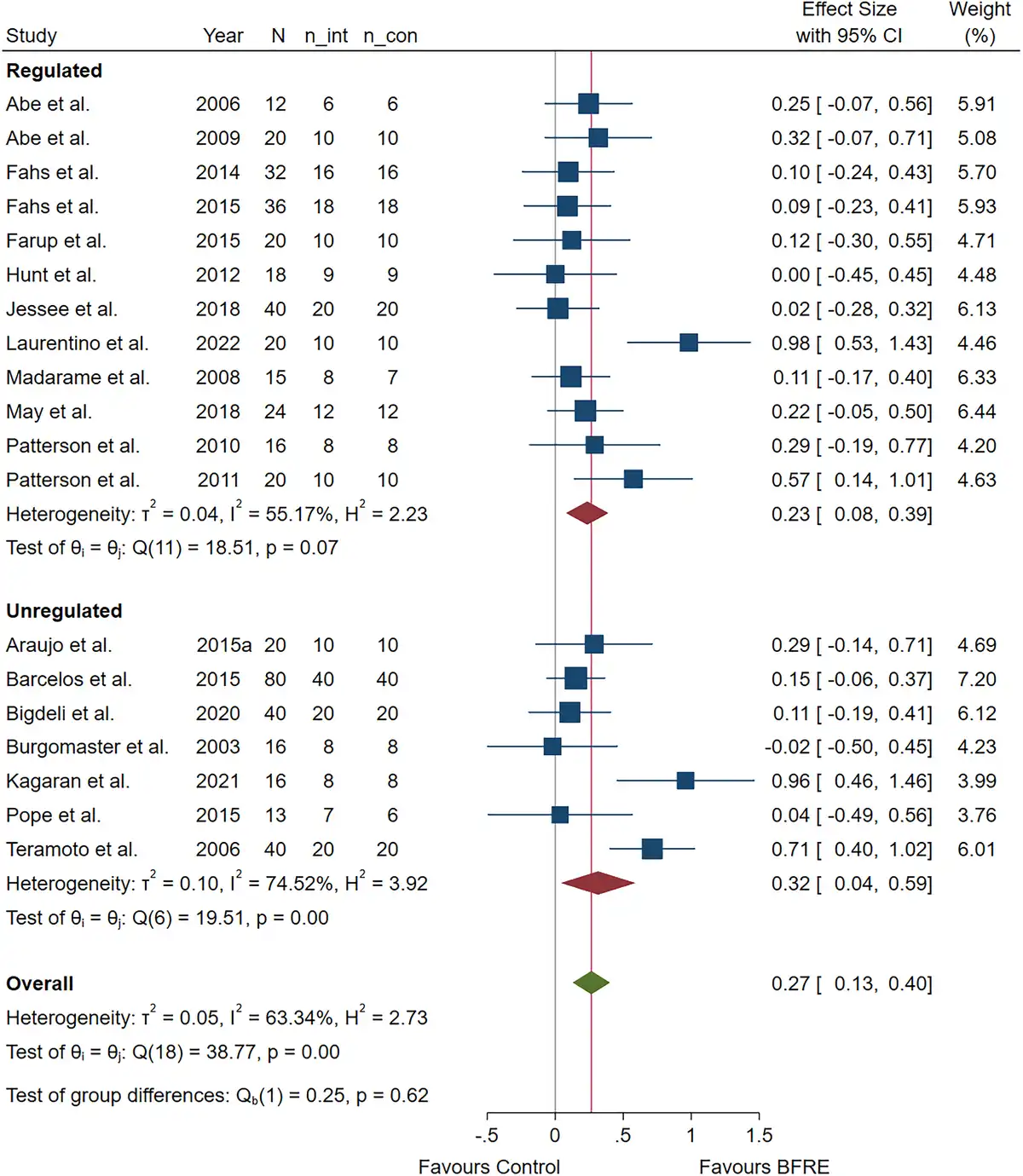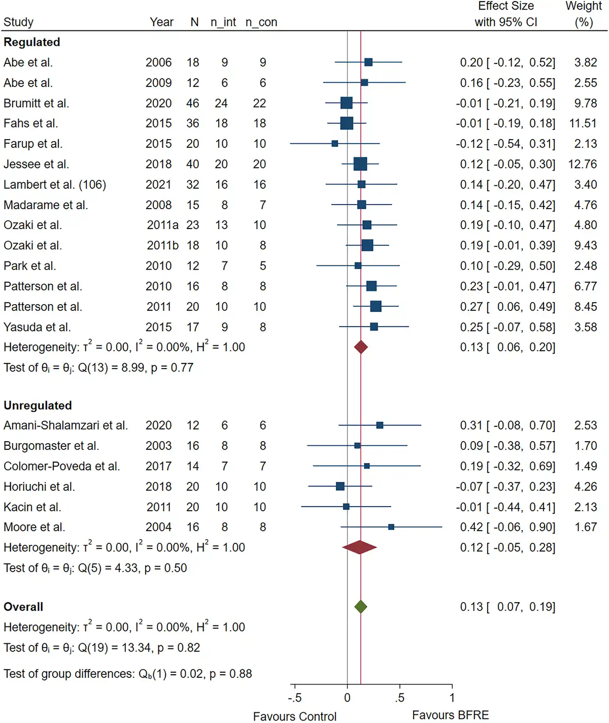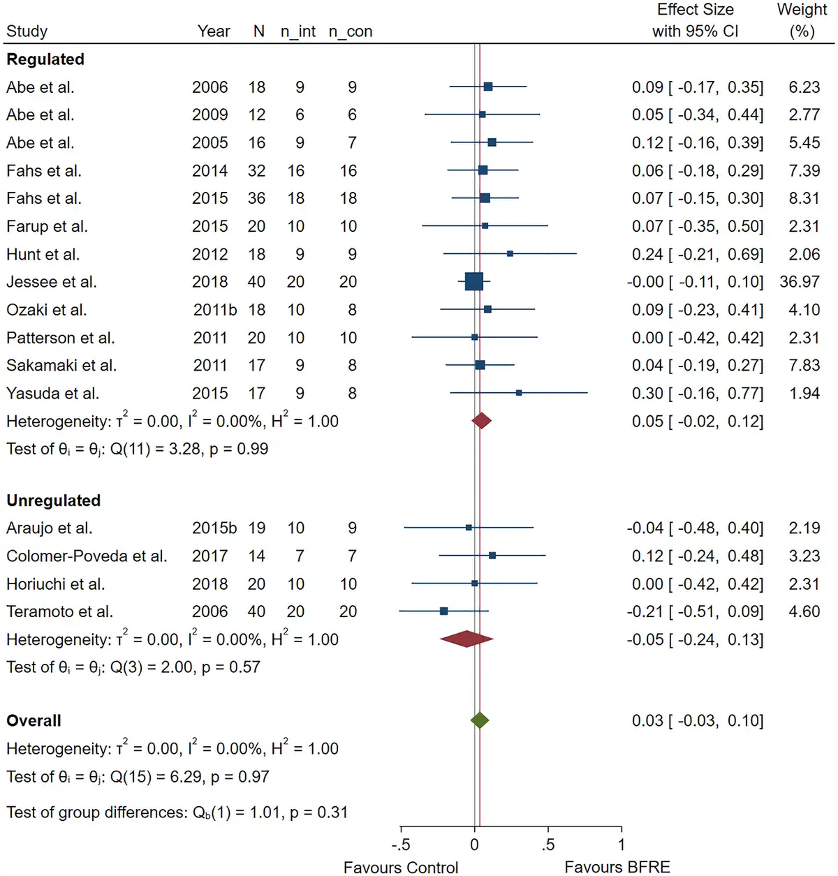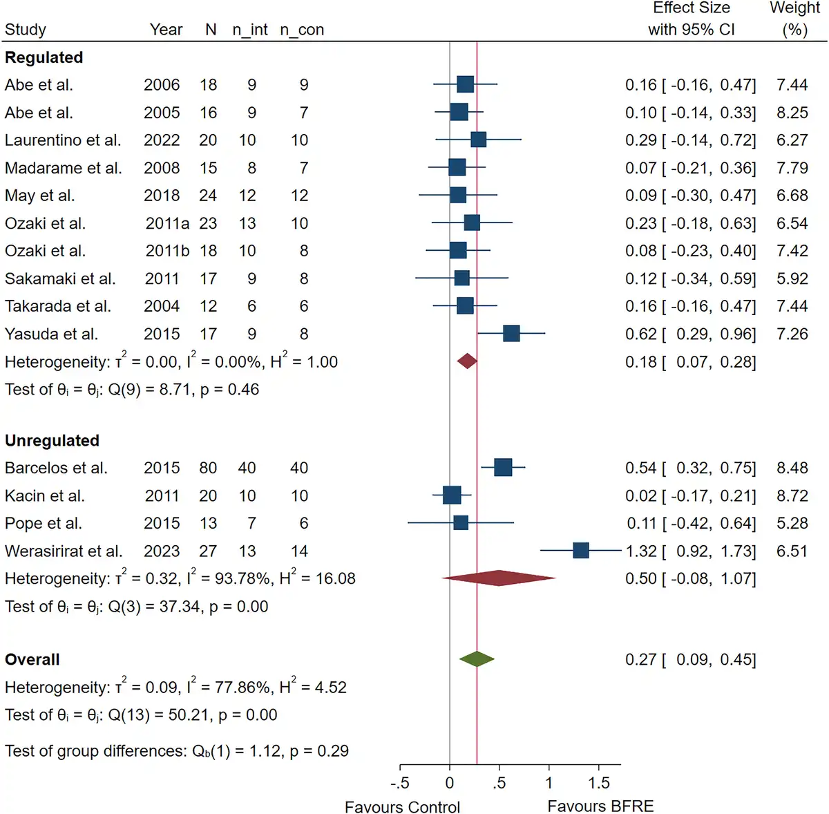 When specifically examining the sub-group analyses contrasting unregulated and regulated blood flow restriction pressure systems (Figures 36), this remains largely unchanged. For repetition maximum muscle strength, unregulated blood flow restriction pressure systems [ES = 0.32, 95% CI (0.04, 0.59); heterogeneity (Q = 19.51, P < 0.01, I2= 74.52%)] and regulated blood flow restriction pressure systems [ES = 0.23, 95% CI (0.08, 0.39); heterogeneity (Q = 18.51, P = 0.07, I2= 55.17%)] were not significantly different (P = 0.62), with both groups displaying moderate-to-high heterogeneity. For muscle strength via dynamometry, unregulated blood flow restriction pressure systems [ES = 0.12, 95% CI (−0.05, 0.28); heterogeneity (Q = 4.33, P = 0.50, I2= 0%)] and regulated blood flow restriction pressure systems [ES = 0.13, 95% CI (0.06, 0.20); heterogeneity (Q = 8.99, P = 0.77, I2= 0%)] were not significantly different (P = 0.88). For muscle cross-sectional area, unregulated blood flow restriction pressure systems [ES = 0.50, 95% CI (−0.08, 1.07); heterogeneity (Q = 37.34, P < 0.01, I2= 93.78%)] and regulated blood flow restriction pressure systems [ES = 0.18, 95% CI (0.07, 0.28); heterogeneity (Q = 8.71, P = 0.46, I2= 0%)] were not significantly different (P = 0.29), although the unregulated group showed very high heterogeneity. For muscle anthropometry, unregulated blood flow restriction pressure systems [ES = −0.05, 95% CI (−0.24, 0.13); heterogeneity (Q = 2, P = 0.57, I2= 0%)] and regulated blood flow restriction pressure systems [ES = 0.05, 95% CI (−0.02, 0.12); heterogeneity (Q = 3.28, P = 0.99, I2= 0%)] were not significantly different (P = 0.31).