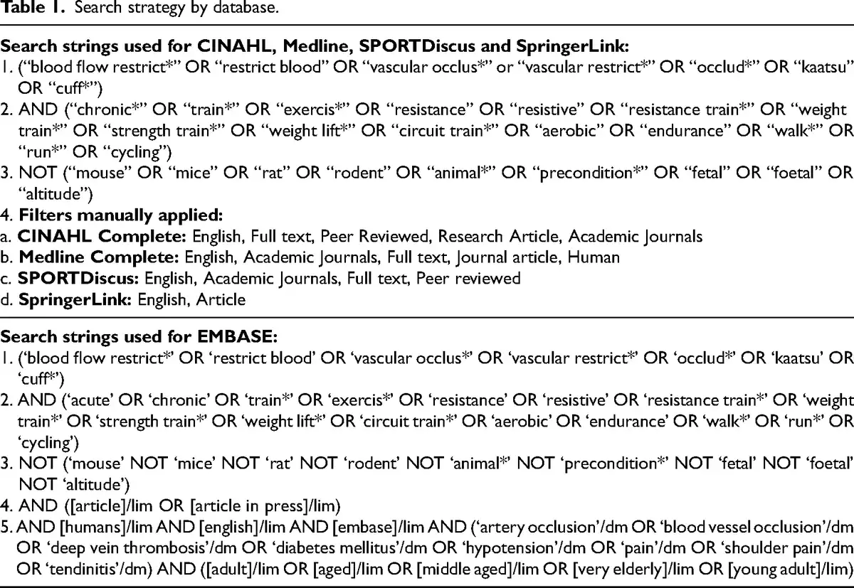 The electronic database search included using the tool EBSCOhost and other online database search engines. The search included Medline, SPORTDiscus, CINAHL, Embase and SpringerLink. Search terms were derived from ‘blood flow restriction’, ‘vascular occlusion’ and ‘chronic exercise’ (Table 1). Search results were filtered within the database where possible for the filters ‘Human’, ‘English’, ‘research article’ and/or ‘full text’. Search results included dates from inception until the date of the search (31 December 2023).