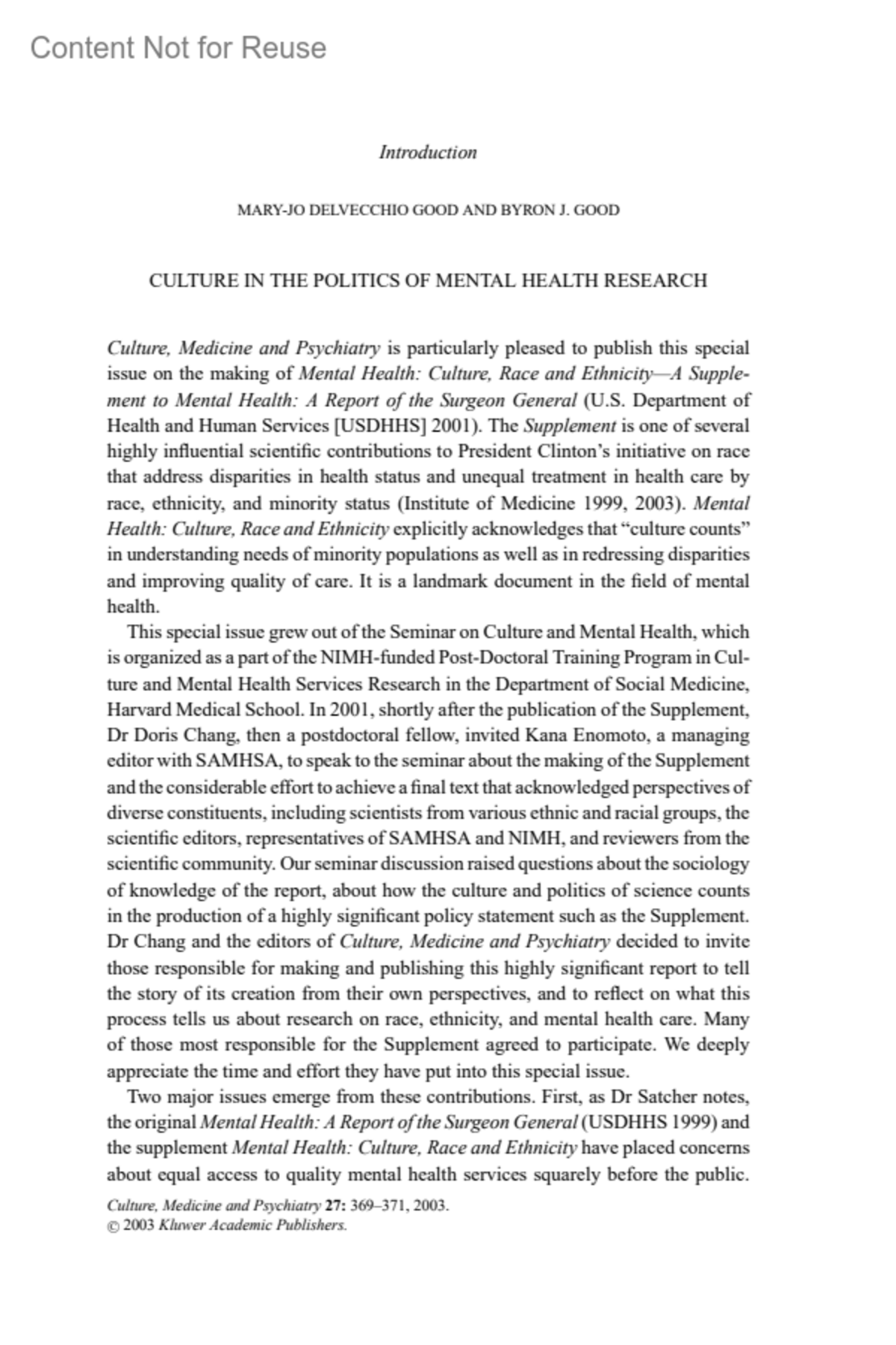CULTURE IN THE POLITICS OF MENTAL HEALTH RESEARCH