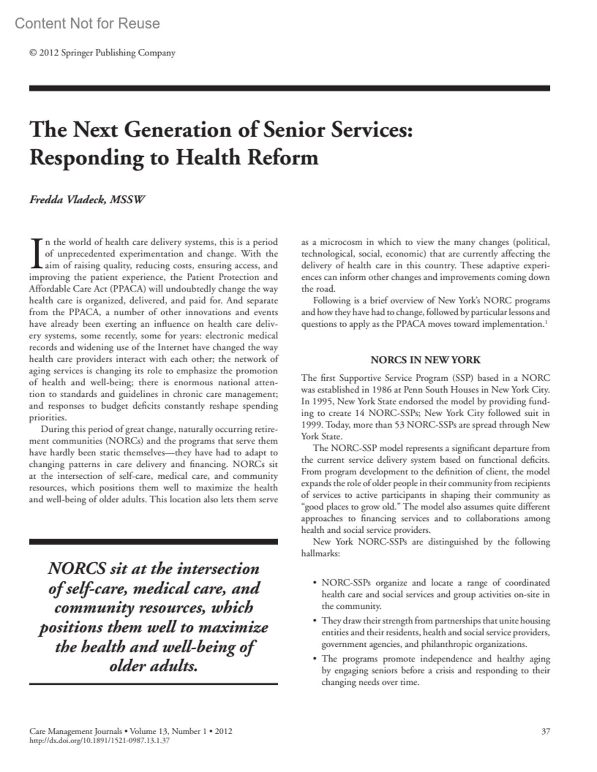 Fredda Vladeck, MSSW, is director of the United Hospital Fund's Aging In Place Initiative, which focuses on advancing new service delivery models that address the critical issues presented by the growing number of people who are aging in place in their communities. She was the founding director of the first comprehensive NORC Supportive Service Program at Penn South (1986), and worked with others to translate and replicate this innovative model at the city and state levels. As a certified social worker for 25 years, Ms. Vladeck has been a longtime advocate for seniors and vulnerable populations.