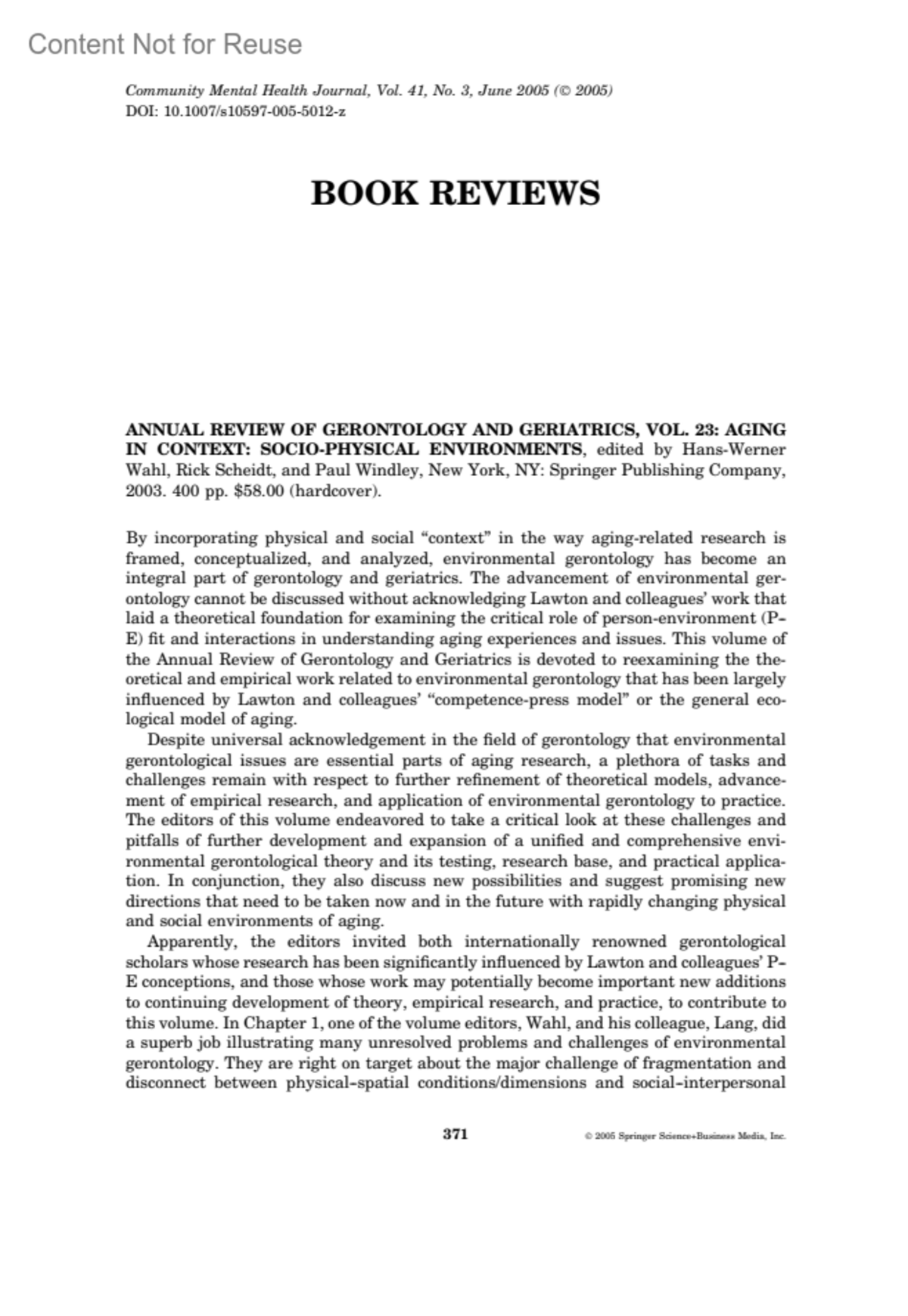 AGING IN CONTEXTSOCIO-PHYSICAL ENVIRONMENTS,edited by Hans-Werner Wahl, Rick Scheidt, and Paul Windley, New York, NYSpringer Publishing Company, 2003. 400 pp. $58.00 (hardcover).