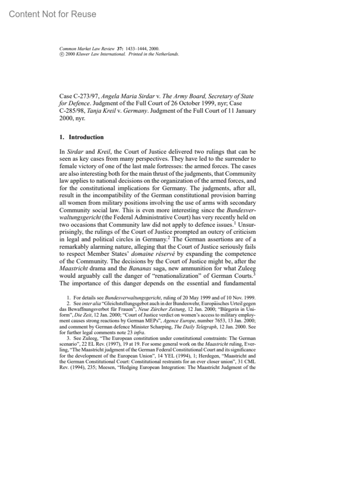 Judgment of the Full Court of 26 October 1999, nyr; Case C-285/98, Tanja Kreil v. GermanyGermany. Judgment of the Full Court of 11 January 2000, nyr.