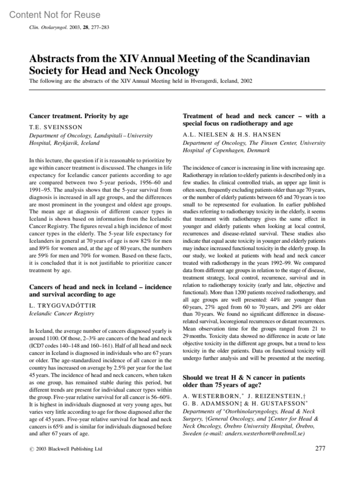 Sentinel node biopsy – the technique and feasibility in head and neck cancerBILDE, A.BUCHWALD, C.Author informationDepartment of Otolaryngology, Head & Neck Surgery, Rigshospitalet, Copenhagen, DenmarkClinical Otolaryngology & Allied Sciences 28(3):p 282-283, June 2003.Copyright © 2003 Blackwell Science Ltd.