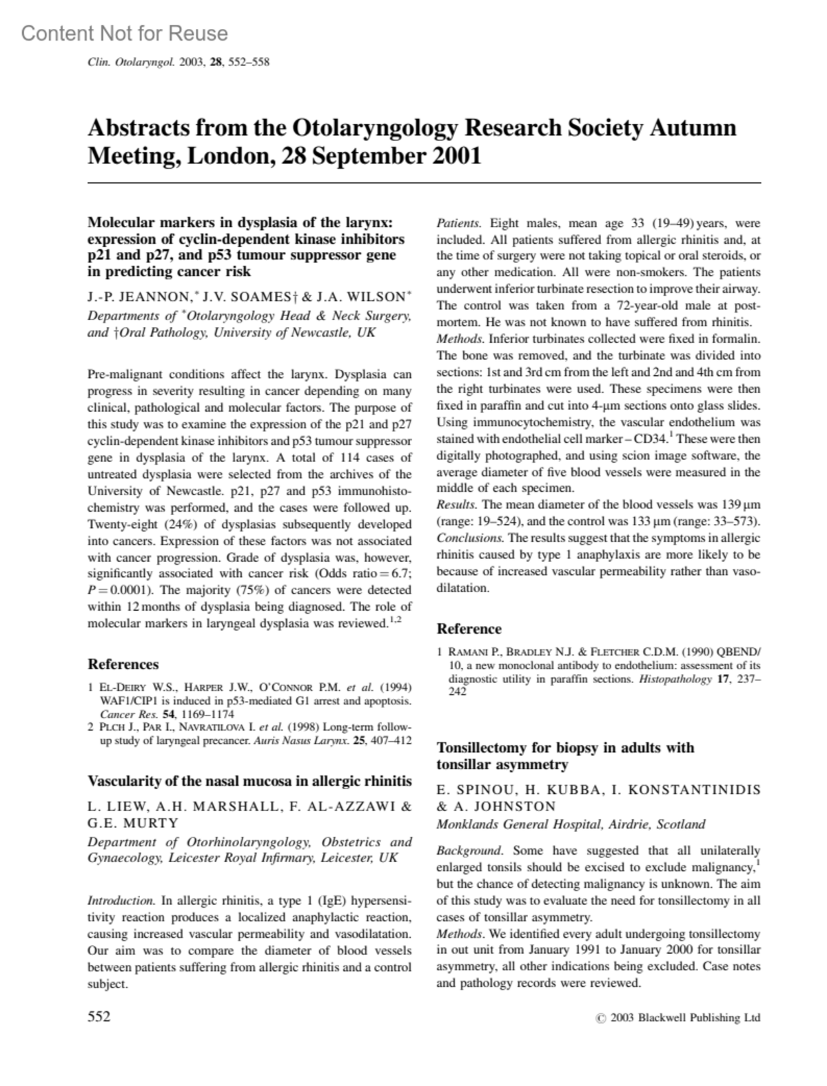 Clinical Otolaryngology & Allied Sciences 28(6):p 552, December 2003.