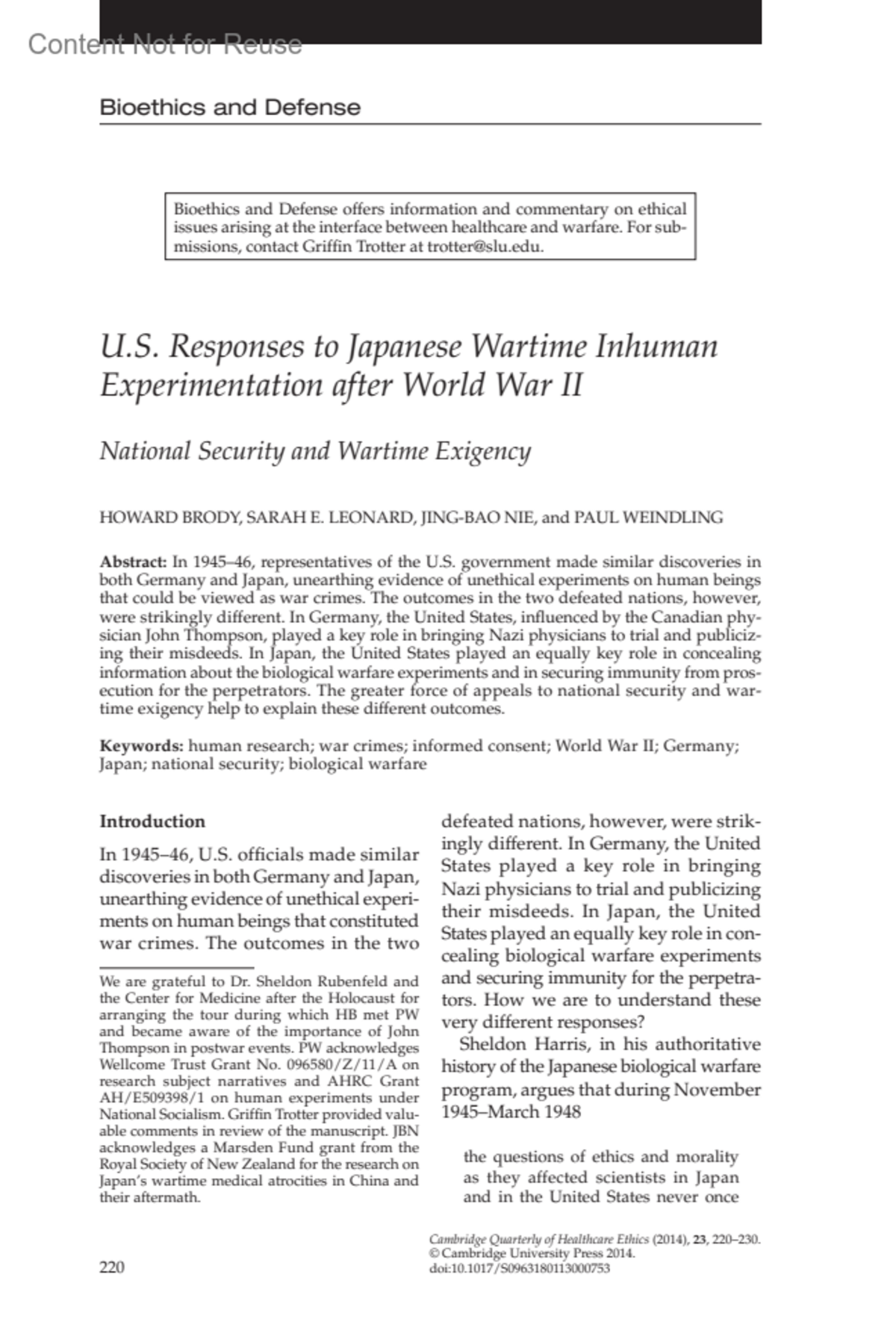 U.S. Responses to Japanese Wartime Inhuman Experimentation after World War II